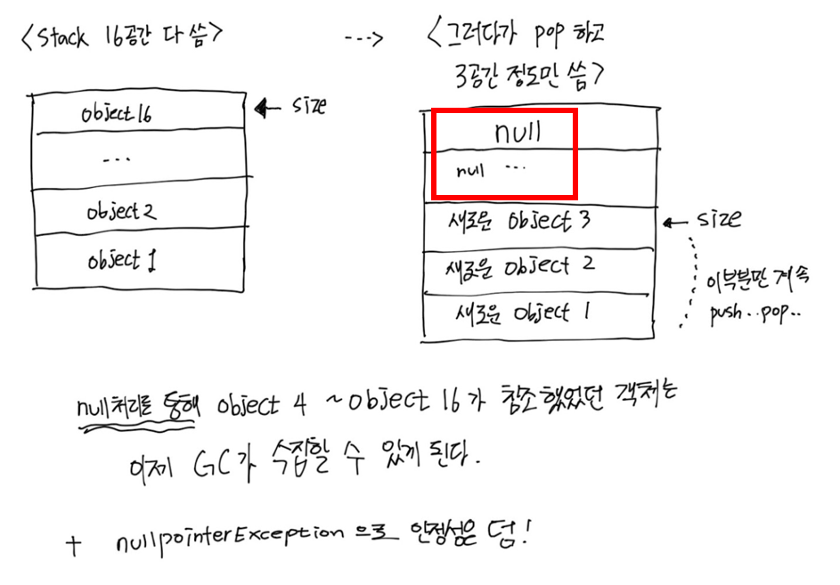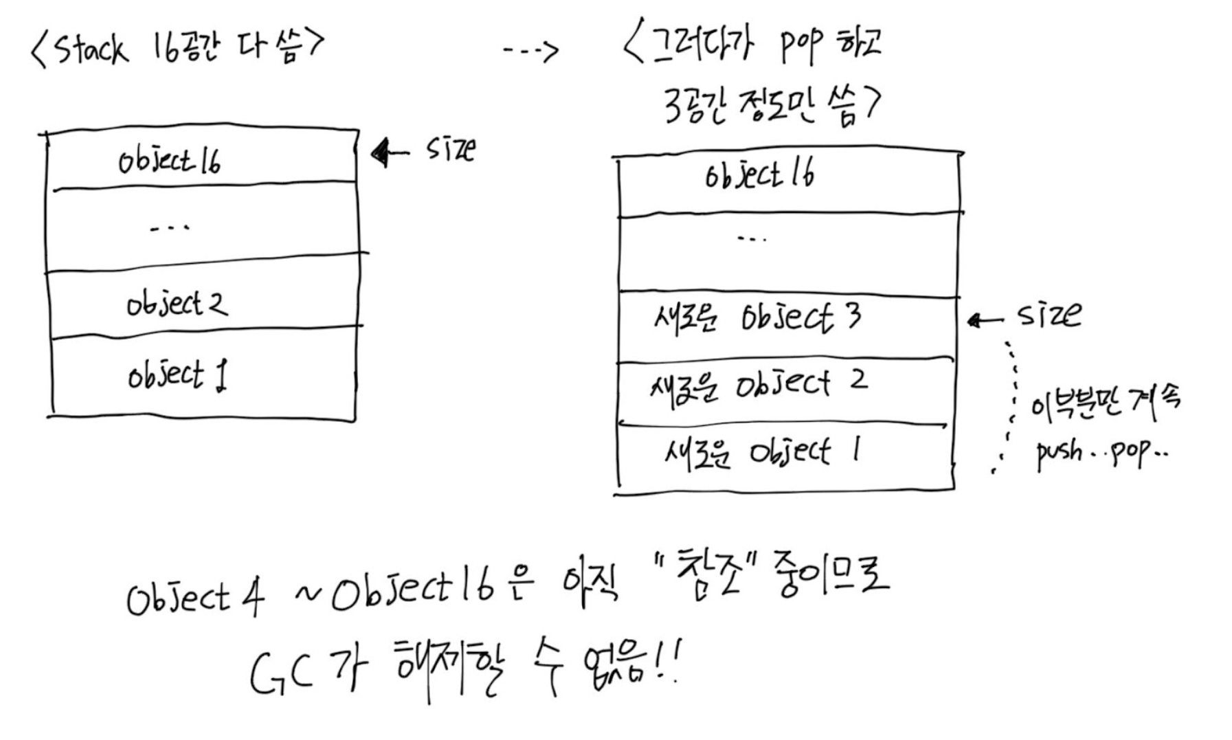 아래에 Stack 기능을 구현한 소스코드가 있고 , 여기에는 GC가 수집할 수 없는 객체가 존재한다.