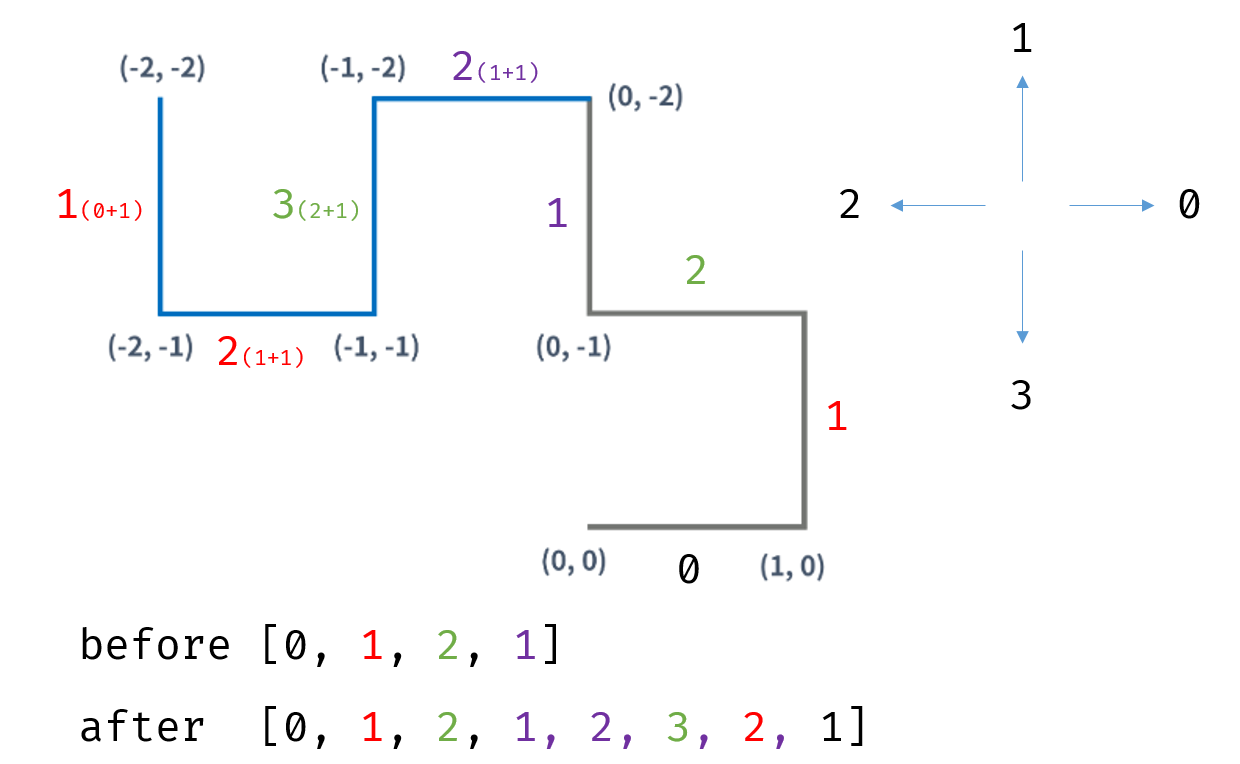 이때 전체 방향에 +1 를 해주면 [1,2] 가 됩니다. 하지만 이때 역순으로 이동해줘야합니다. 이후 방향은 [0,1,2,1] 이 됩니다.