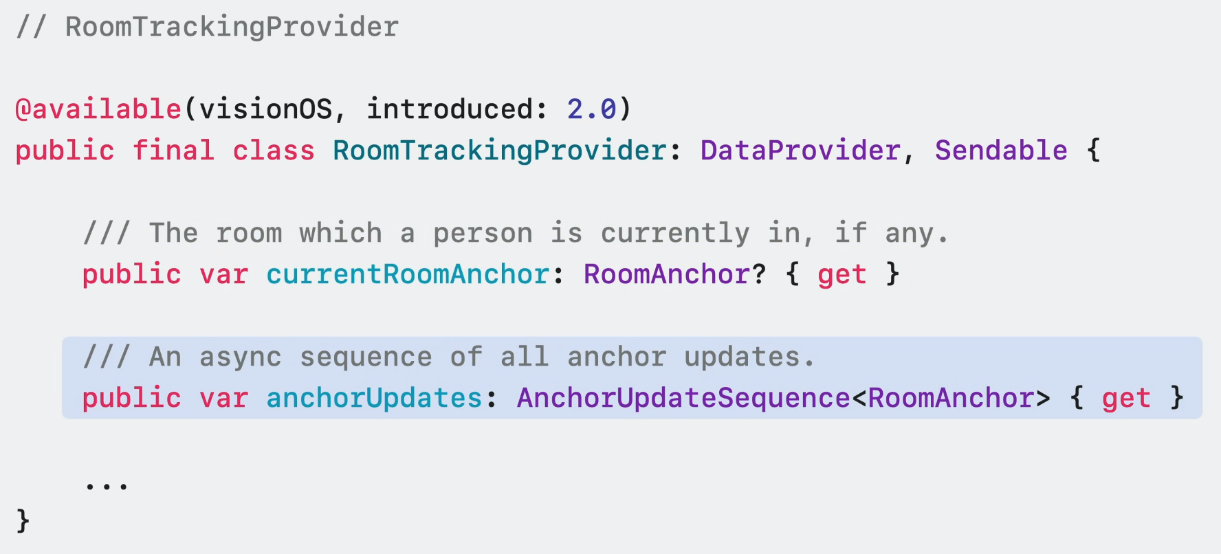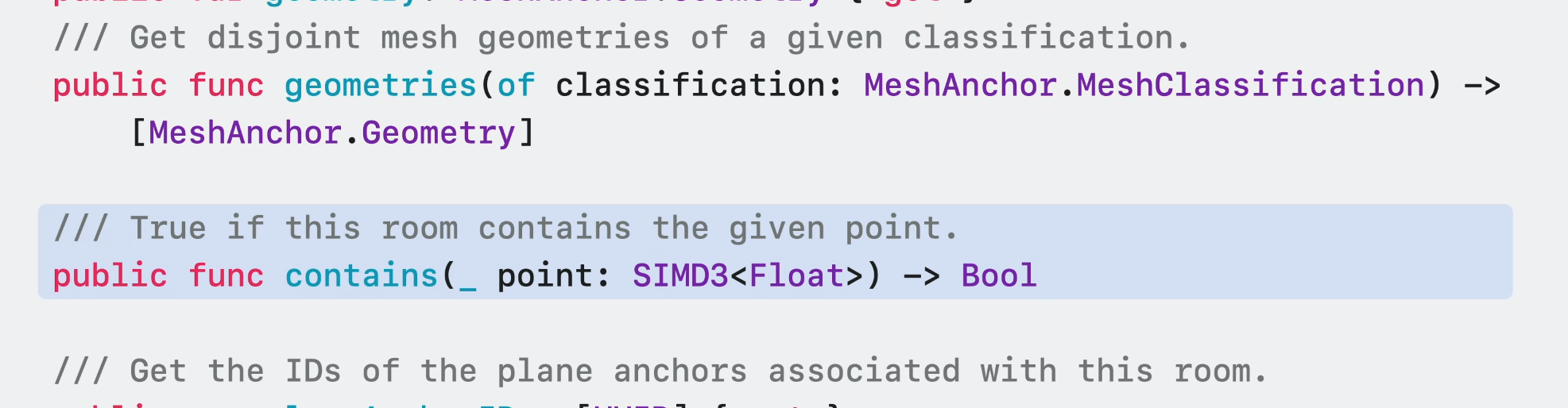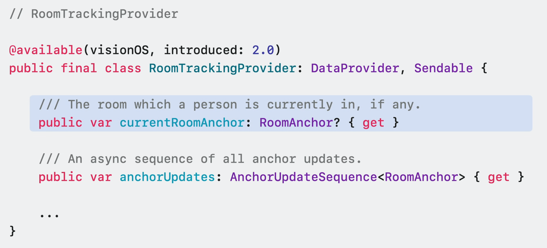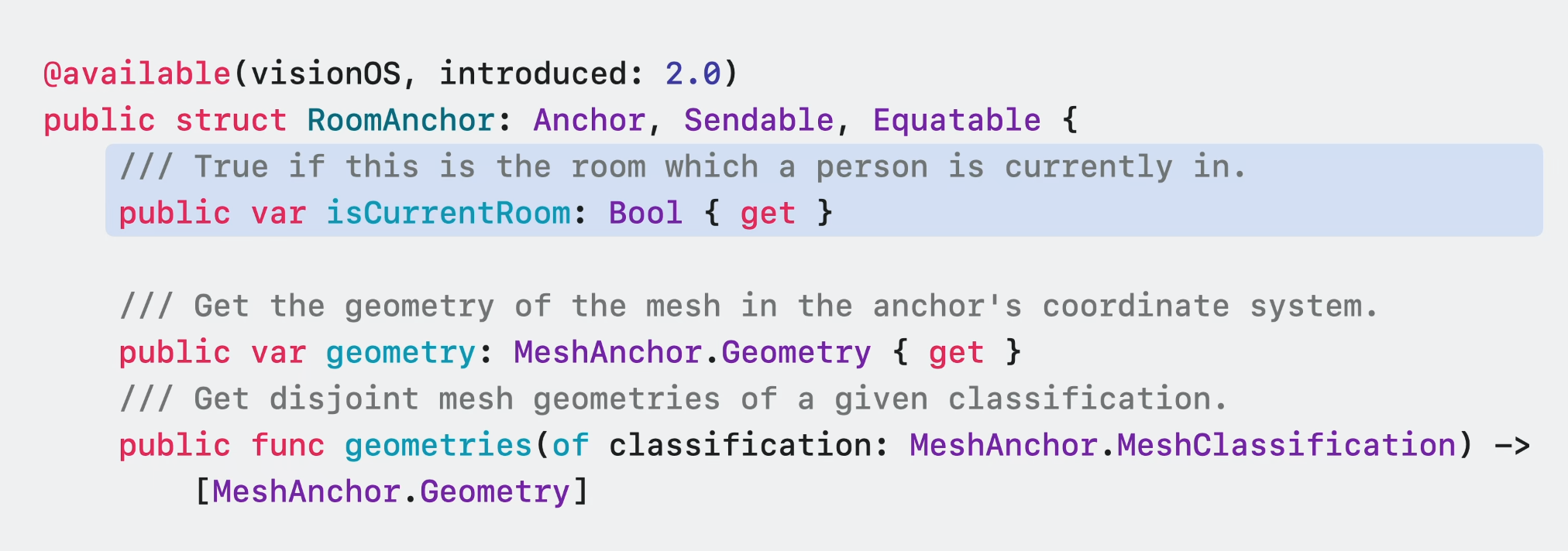 ARKit이 사용자가 밀폐된 공간에 있다고 판단하는 경우 이 인터페이스를 통해 현재 방의 anchor에 접근할 수 있다. 현재 방 anchor를 사용하여 실내 레이아웃에 맞춘 경험을 형성할 수 있다.