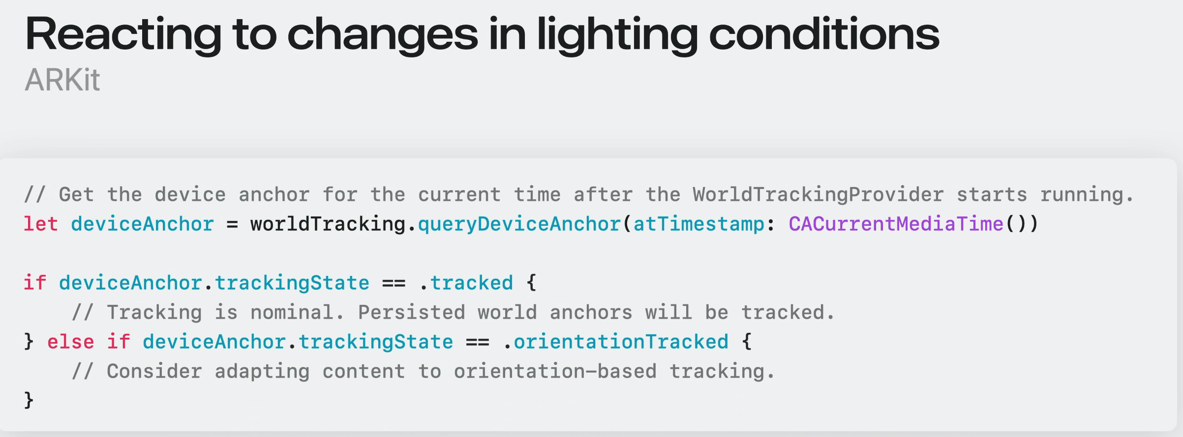 ARKit에서는 확장된 DeviceAnchor가 trackingState 속성을 보유하므로 추적이 완전히 작동하는지 또는 방향 기반 추적으로만 제한되는지 알 수 있다. 시스템이 orientation-based tracking으로 전환한다면, 기존 공간 앵커는 not tracked로 표시될 수 있다.