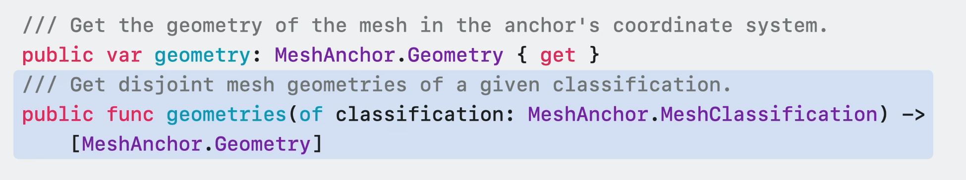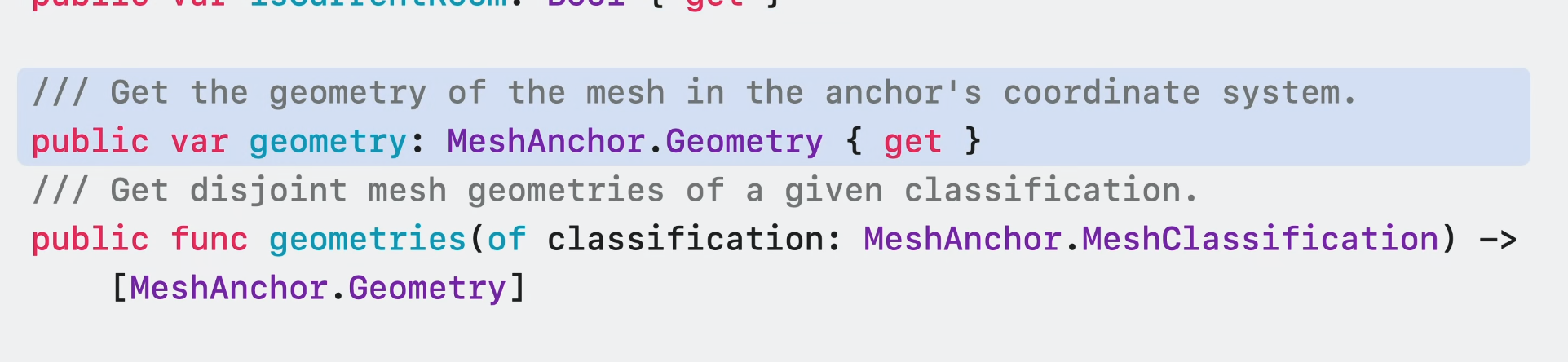 각 RoomAnchor는 주변 벽과 바닥의 geometry로 보유한다. 이는 방의 모양을 정의하는 꼭짓점, edge, 삼각형 면의 모음으로 구성된다. 이 mesh는 mesh 및 평면 앵커에서 볼 수 있는 geometry에 비해 방의 경계를 더 잘 나타낸다.