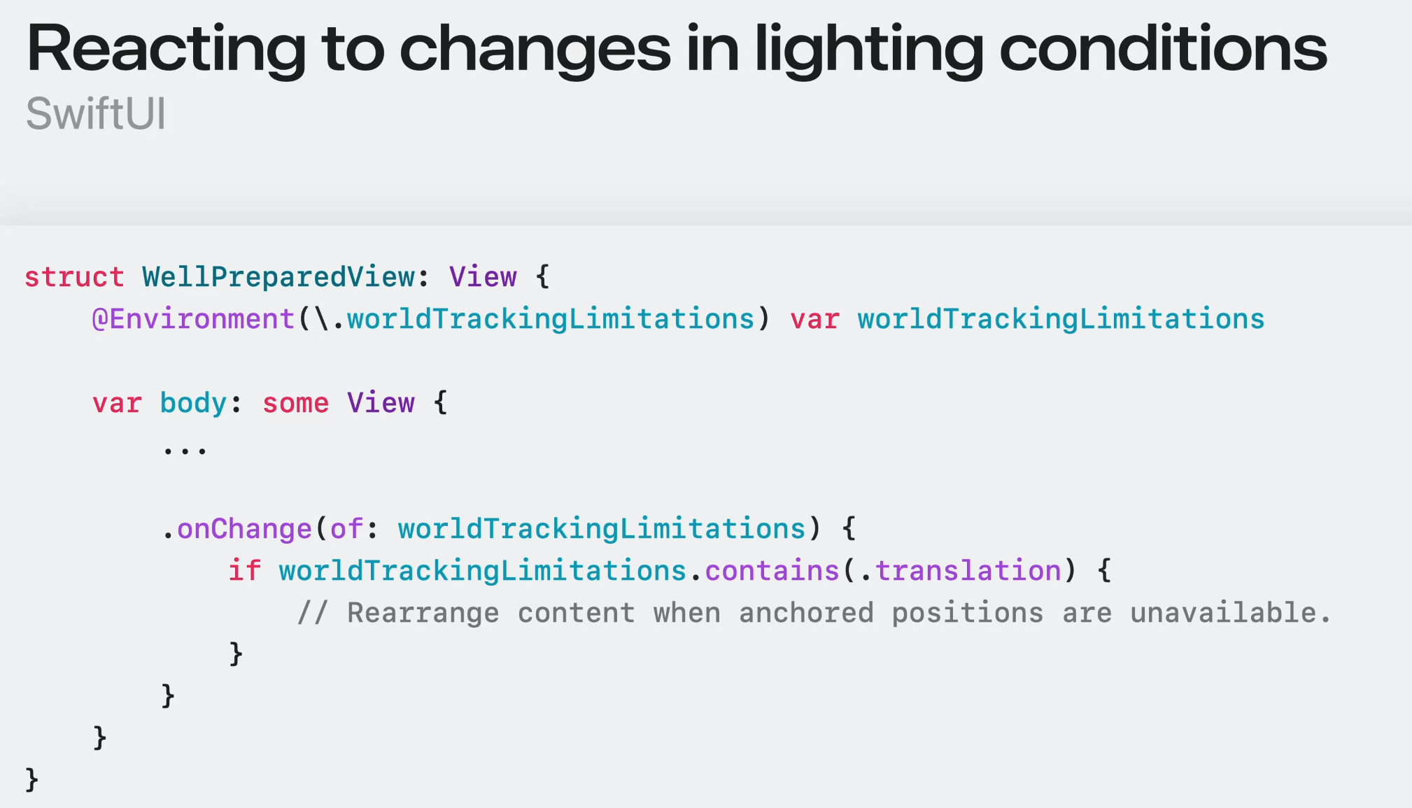 SwiftUI를 사용하는 경우, 새로운 worldTrackingLimitations 환경 값 envionment value를 통해 이 표시를 사용할 수 있다.