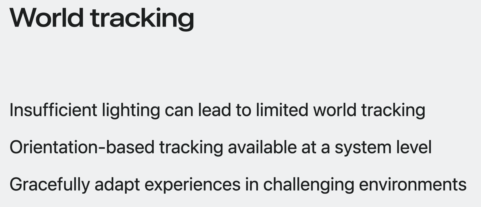 앱이 full world tracking에 완전히 의존하는 경우 사용자에게 더 밝은 환경으로 이동하여 경험을 다시 시작하도록 요청할 수도 있다.