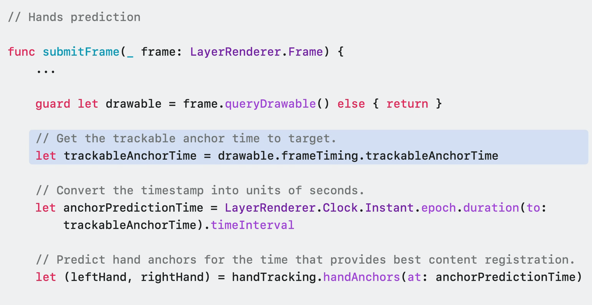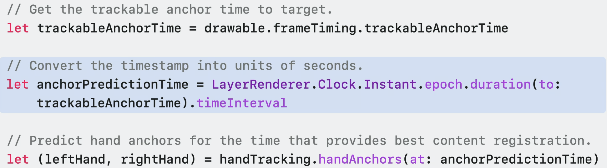 Compositor Service를 사용하는 경우, visionOS에 새로 도입된 'trackable anchor time'을 타겟팅해야 한다. 이 timestamp에서 HandAnchor를 예측하면 콘텐츠를 가장 적절하게 등록하는 데 도움이 된다.