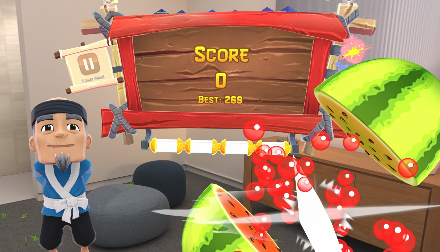 scene understanding feature를 통해 남은 과일이 바닥에 튀는 장면도 표현한다.