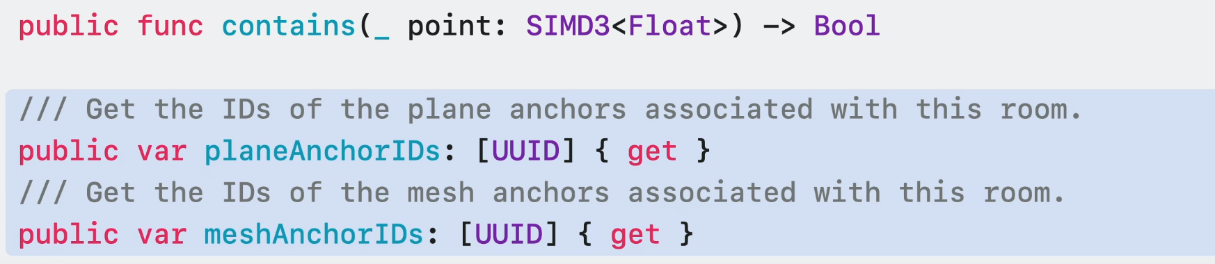 마지막으로, 이 새로운 앵커는 방과 관련된 plane과 mesh anchor id를 제공한다. other scene understanding feature들과 결합하여 앱을 최적화하는 데 유용할 수 있다. 예를 들어 현재 방 외부의 평면 및 mesh에서 고비용 연산을 제외할 수 있다.