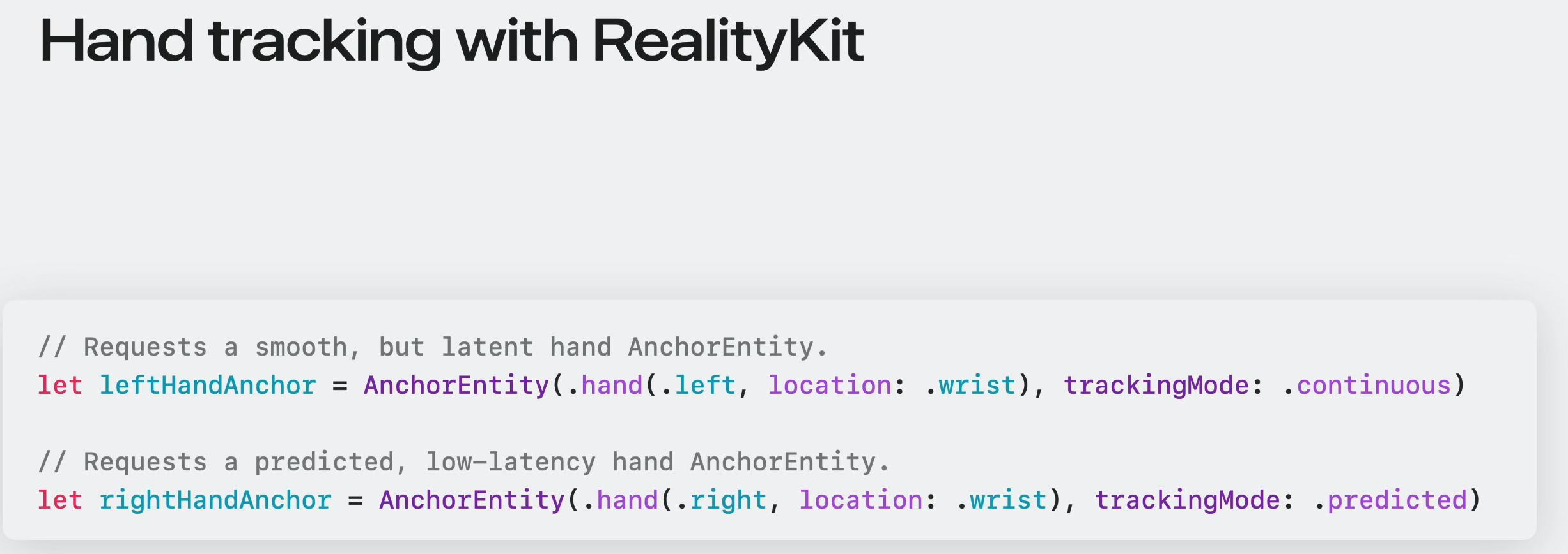 이 개선 사항은 RealityKit의 AnchorEnitites에도 도입되었다. RealityKit을 사용하여 손 근처에 콘텐츠를 둘 때, 필요에 따라 continous or predicted 중에 선택 가능.