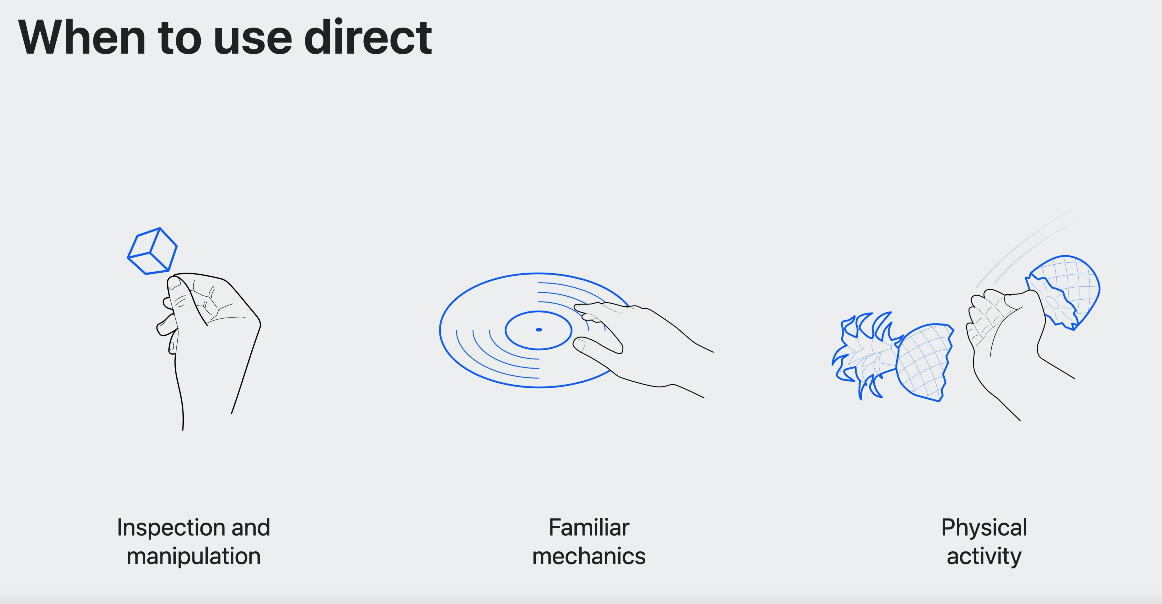 Direct interaction을 디자인 할 때는 손을 공중에 계속 들고 있으면 지칠 수 있다는 것을 염두에 두어야 한다.