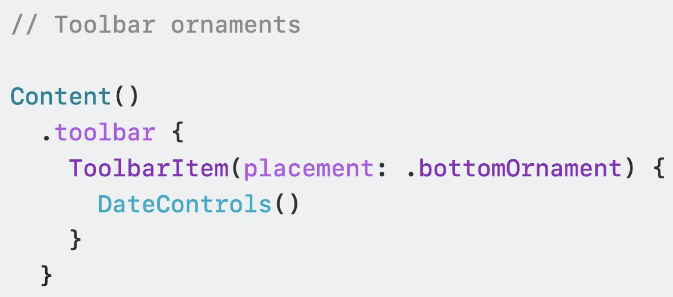 toolbar modifier를 통해 구현 가능하다. Toolbar ornaments는 glass capsule designed background를 자동적으로 제공한다.