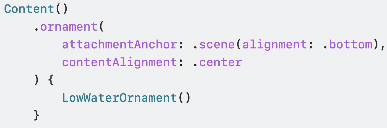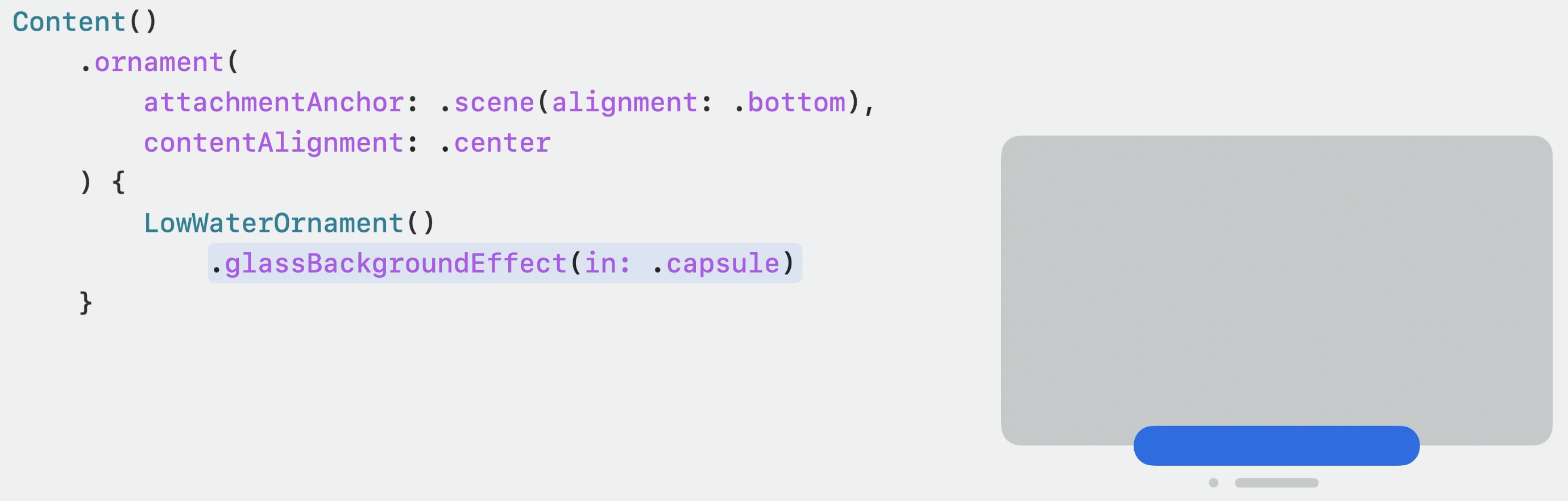 사용자가 custom ornaments의 contents엔 더 많이 control을 포함할 수 있기 때문에 Swift UI는 기본적으로 유리 배경을 제공하지 않는다.