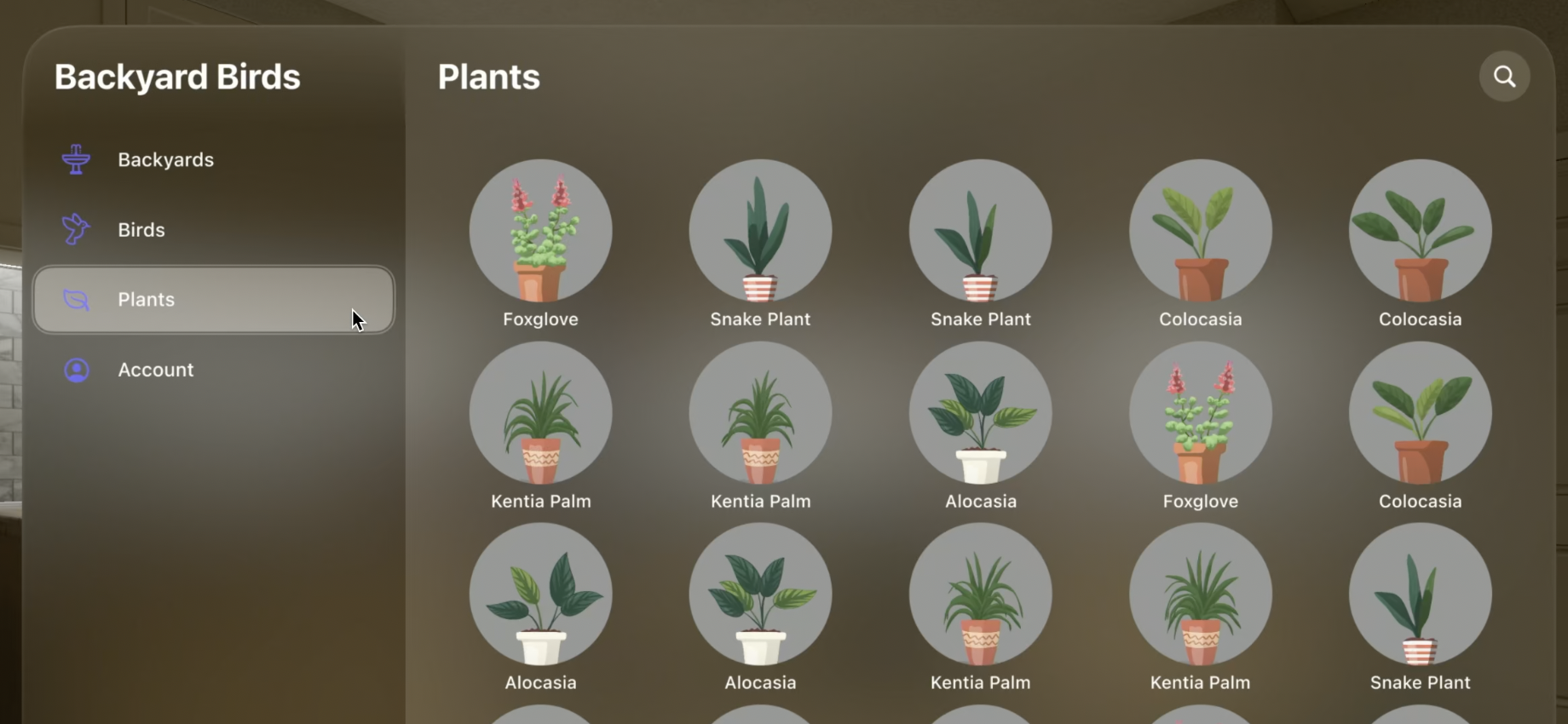 Plants(식물) 탭에는 모든 식물의 그리드가 표시되며, 식물 뒤에 있는 이 원들은 밝고 맞지 않아 보인다.