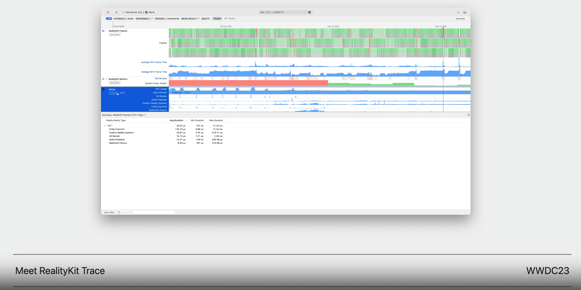 frame 병목지점을 손쉽게 관찰하고 이해하여 시뮬레이션 된 RealityKit 엔티티의 숫자나 제출된 triangle 수와 같이 필수 지표까지 거슬러 추적할 수 있다.