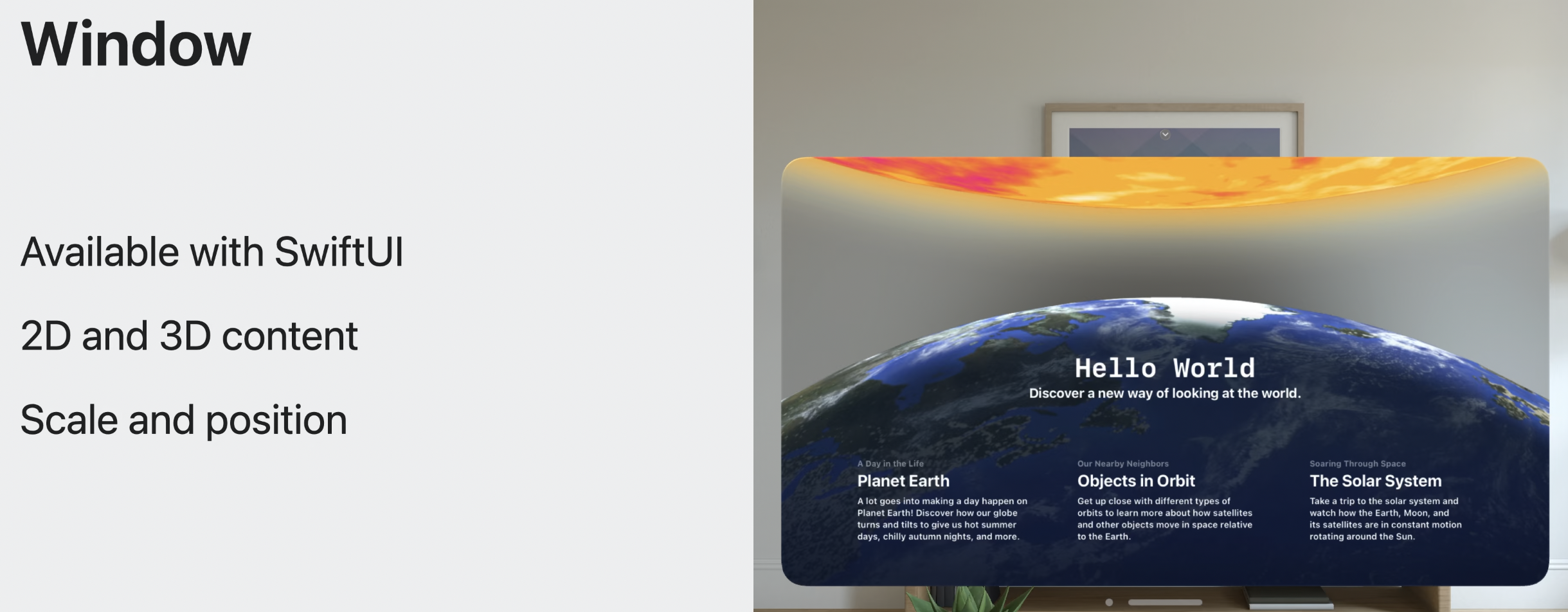 2D와 3D 콘텐츠를 섞는 것을 지원하고, 윈도우는 공간 내에서 크기 조절과 위치 조절이 가능하다.