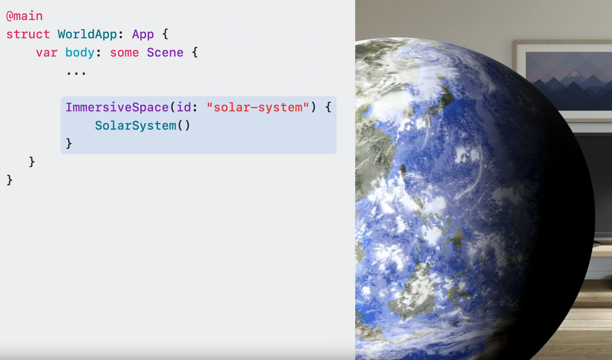 또한 전체 화면을 채우기 위해 fully-immersive space로 render하는 것을 선택할 수도 있는데, 이는 가상 물체에 대한 불빛을 조절하고 오디오 특성을 선택하는 등 앱에 창의적인 요소를 추가할 수 있는 유연함을 제공한다.