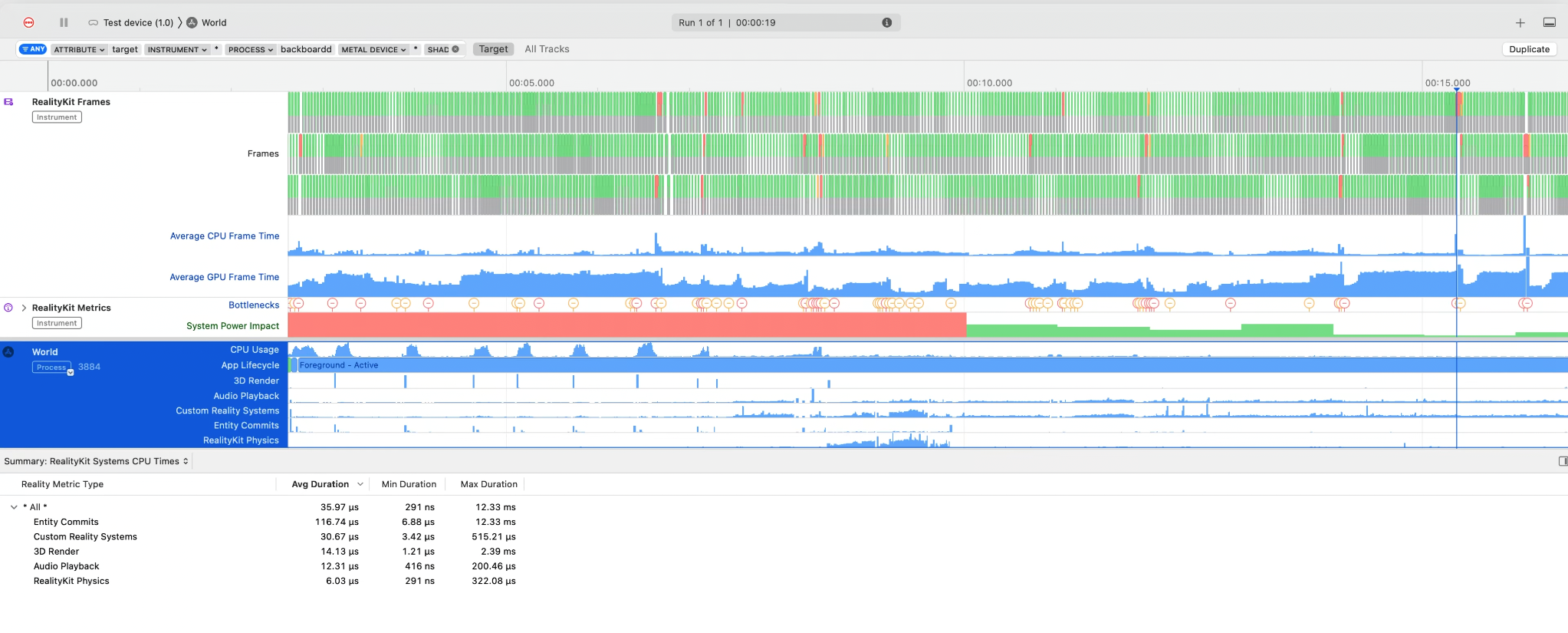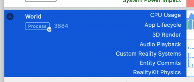 RealityKit Trace 템플릿에는 GPU, CPU, system power impact를 개발자가 이해하고 퍼포먼스 핫스팟을 식별할 수 있도록 하는 instruments가 있다.