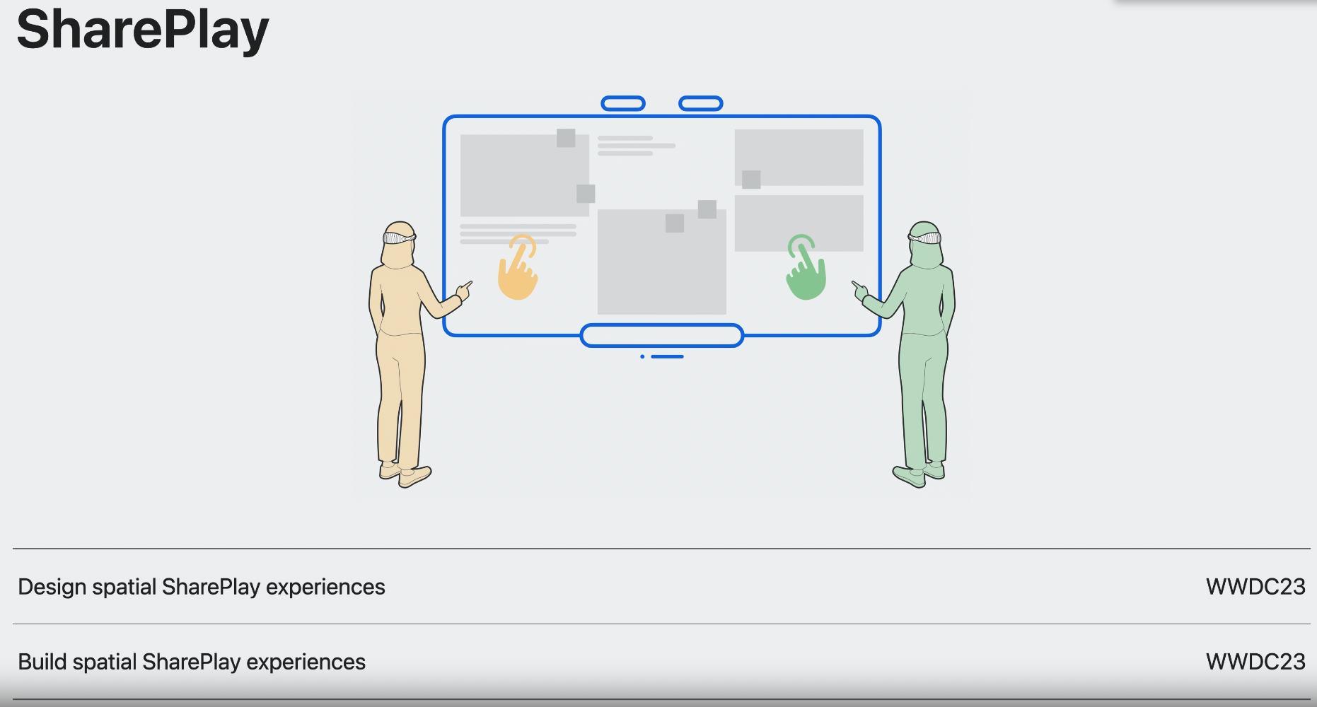 사람들이 뭔가 보이는 것으로 collaborate할 때 모두가 같은 경험을 가진다는 것은 SharePlay에서 매우 중요하다. 이를 통해 사람들은 물리적으로 같이 있는 것 같다는 느낌을 강화할 수 있다.