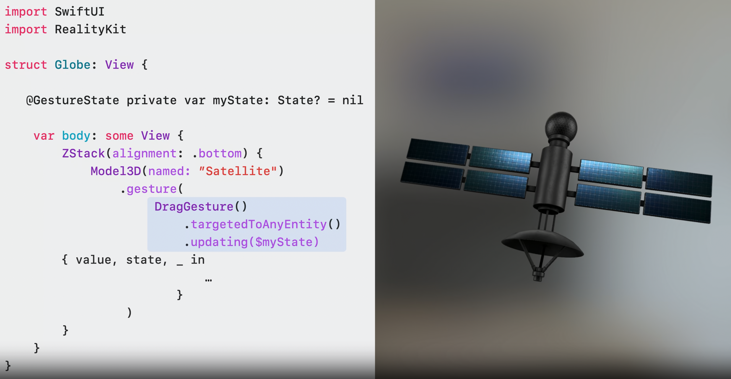 제스쳐는 SwiftUI와 잘 작동하며 같은 gesture API는 ReailityKit entity에 대해서도 잘 작동한다.