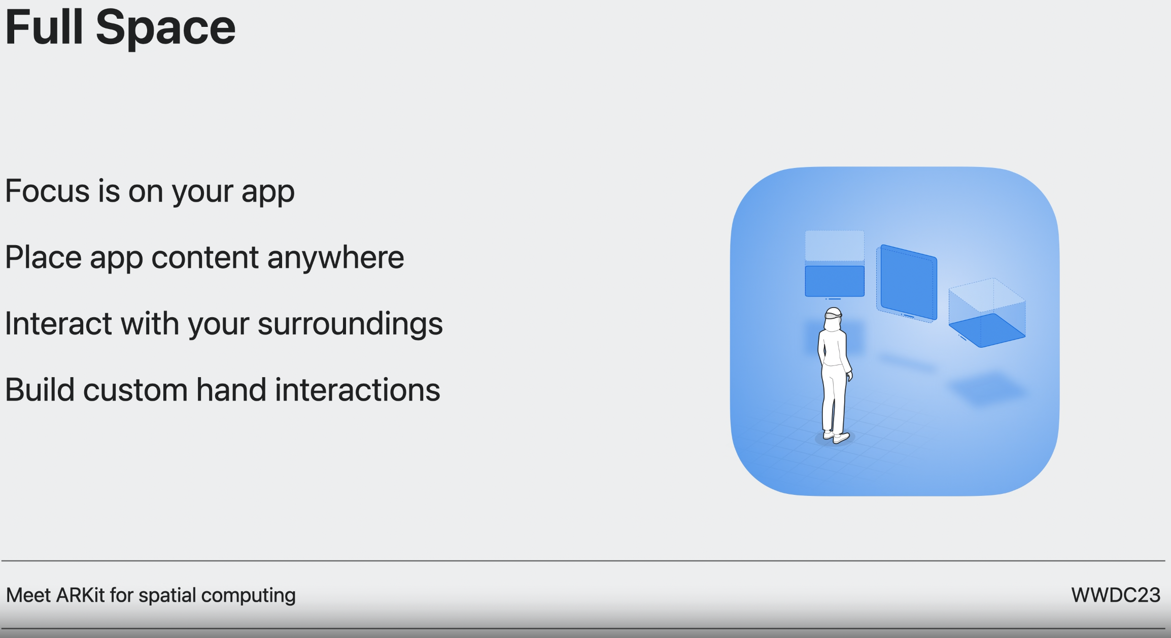 Full Space에서는 Hand Tracking을 더 정교하게 사용하는 등 ARKit을 사용할 수도 있다.