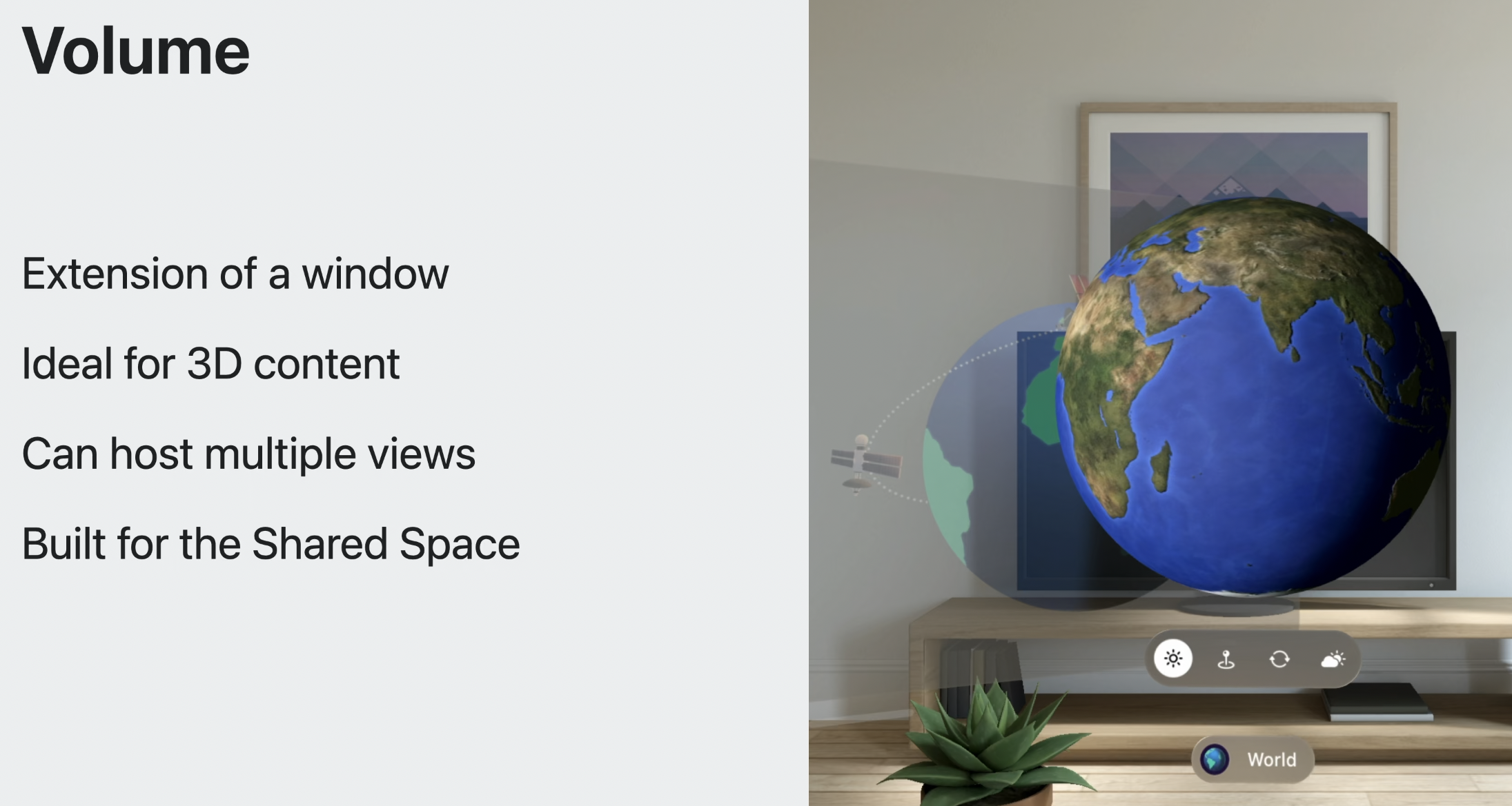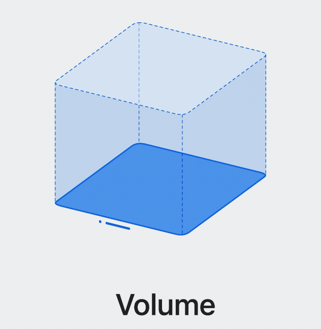 볼륨은 다른 앱들과 공간을 함께 사용하며, 3D 콘텐츠를 정해진 범위 안에서 표시할 수 있다.