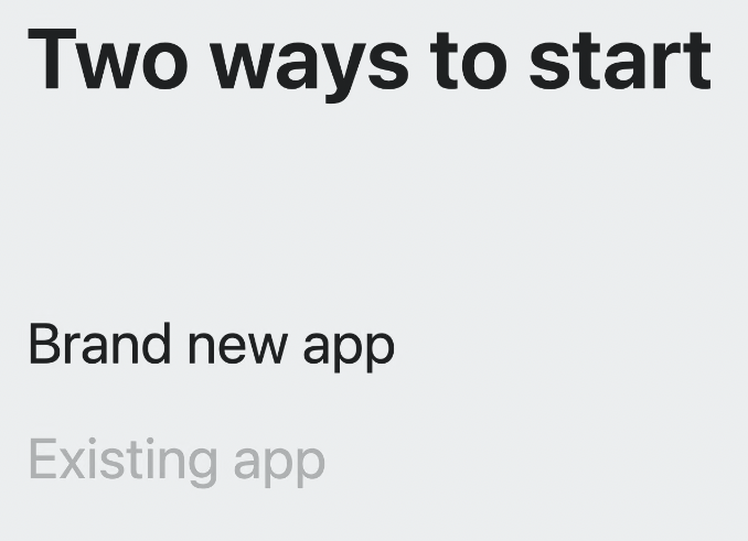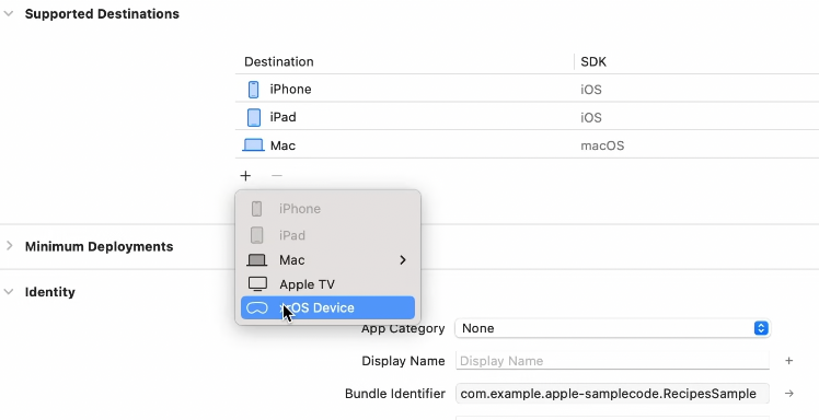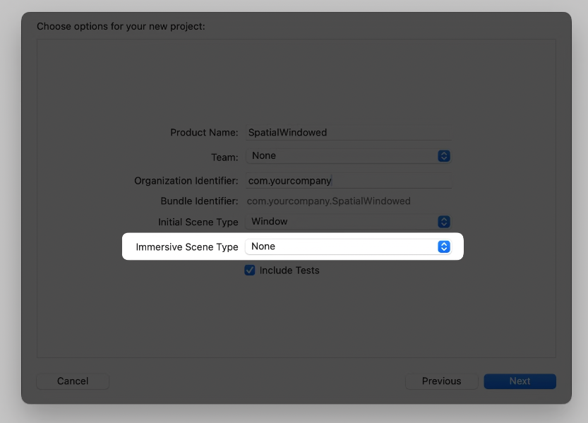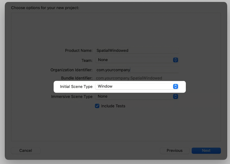 앱 템플릿에는 새로운 두가지 옵션이 존재하는데, 첫번재는 Initial Scene Type을 윈도우나 볼륨으로 고를 수 있다.