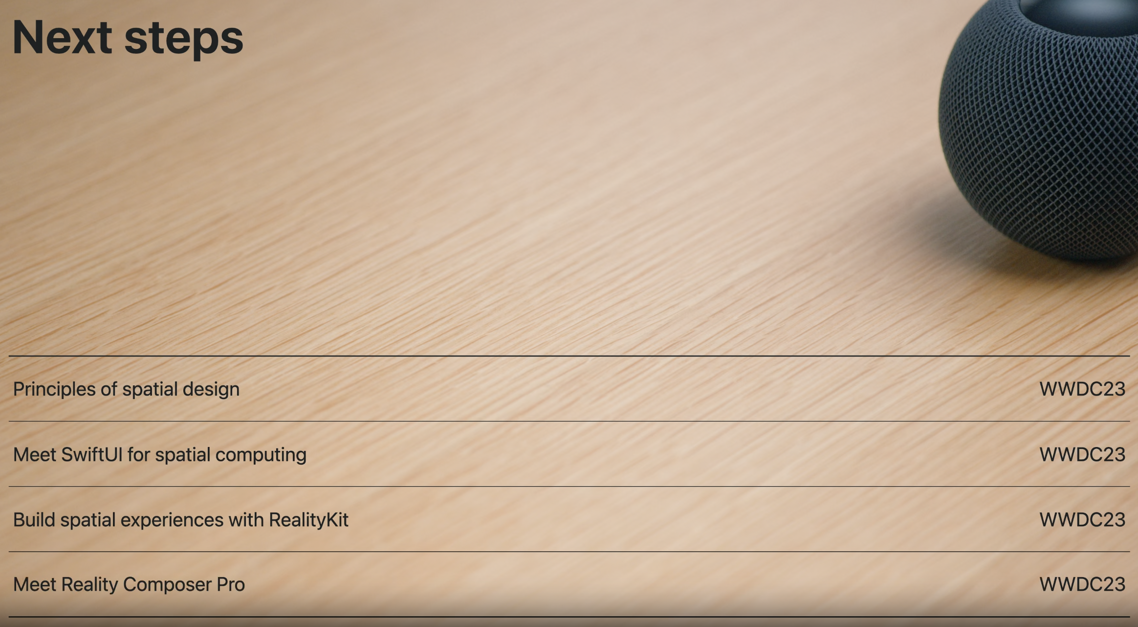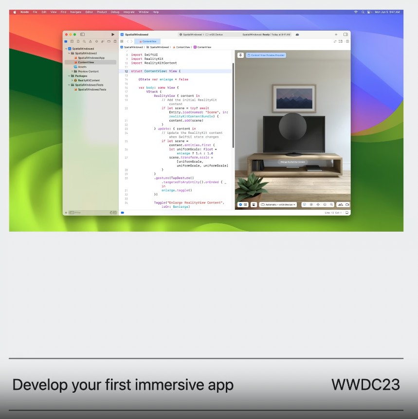 그리고 공간 음향이나 RealityKit을 통해 3D를 렌더링하면 Vision Pro가 계속해서 주변의 시각적인 요소와 소리를 사용자의 주변과 blend하기 위해 방의 구조를 이해하여 업데이트 하는 것에 대한 이점을 자동적으로 경험할 수 있고, 이를 통해 가장 물체가 실제 사용자의 방에 있는 것처럼 느끼게 만든다.