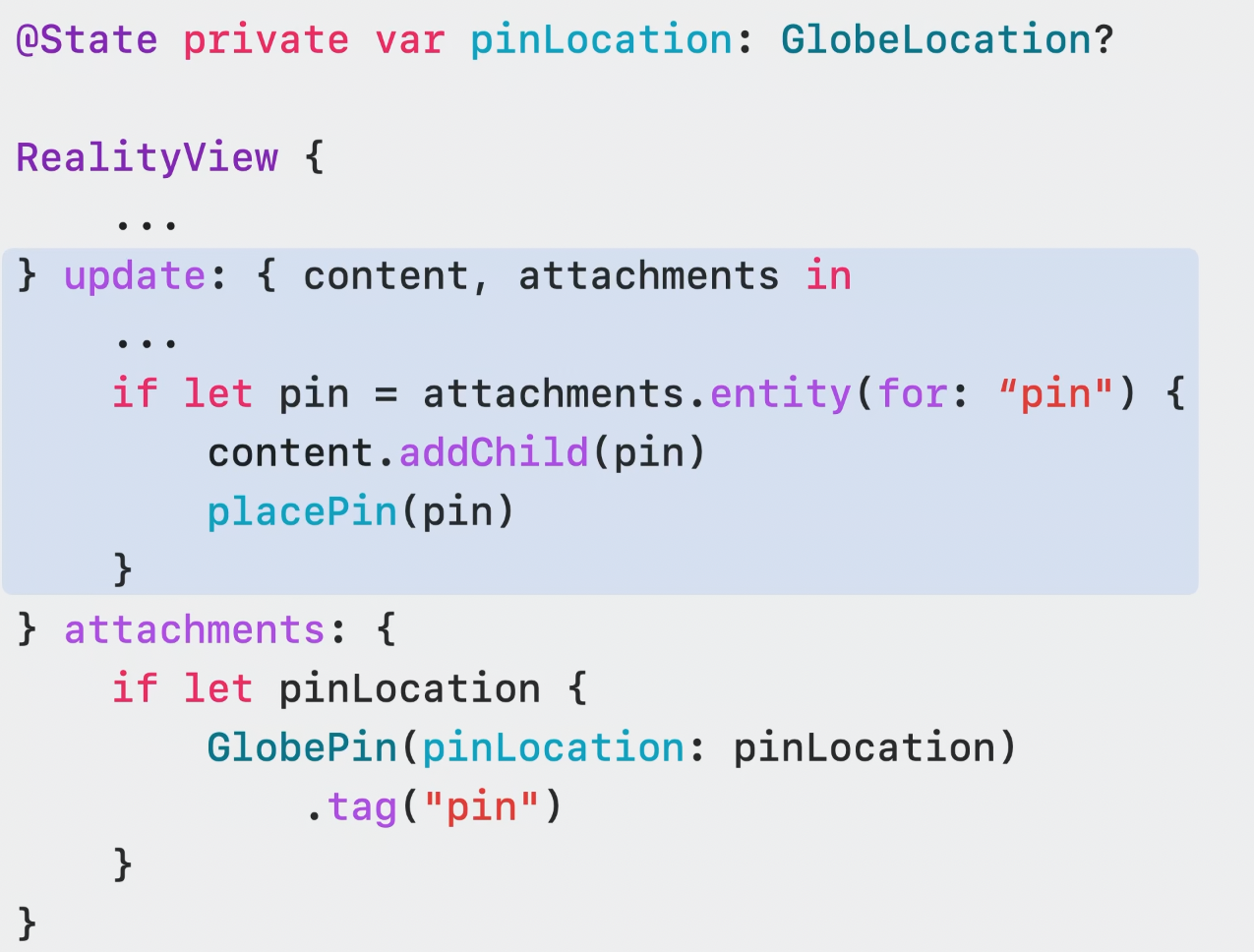 또한 RealityView의 Attachment를 통해 SwiftUI 요소를 3D 씬에 배치할 수 있는 방법을 제공한다.
