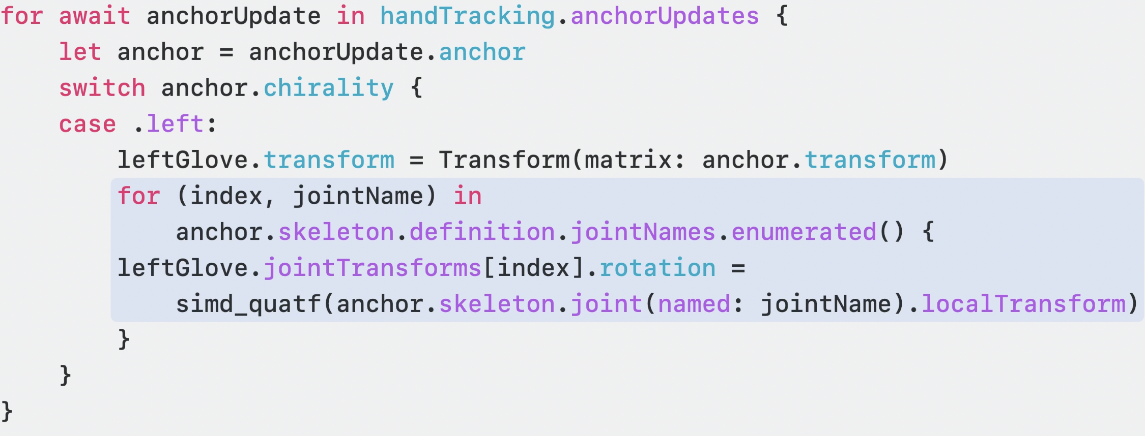 앱은 space가 열려있는 동안 손과 머리 pose 데이터의 접근 권한을 얻기 때문에 이 데이터들을 RealityView내에서 entity를 배치하는데 사용할 수 있다.