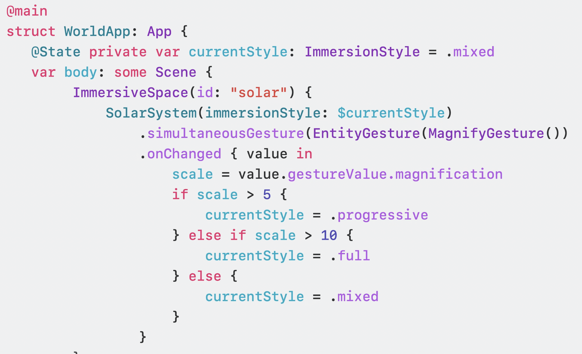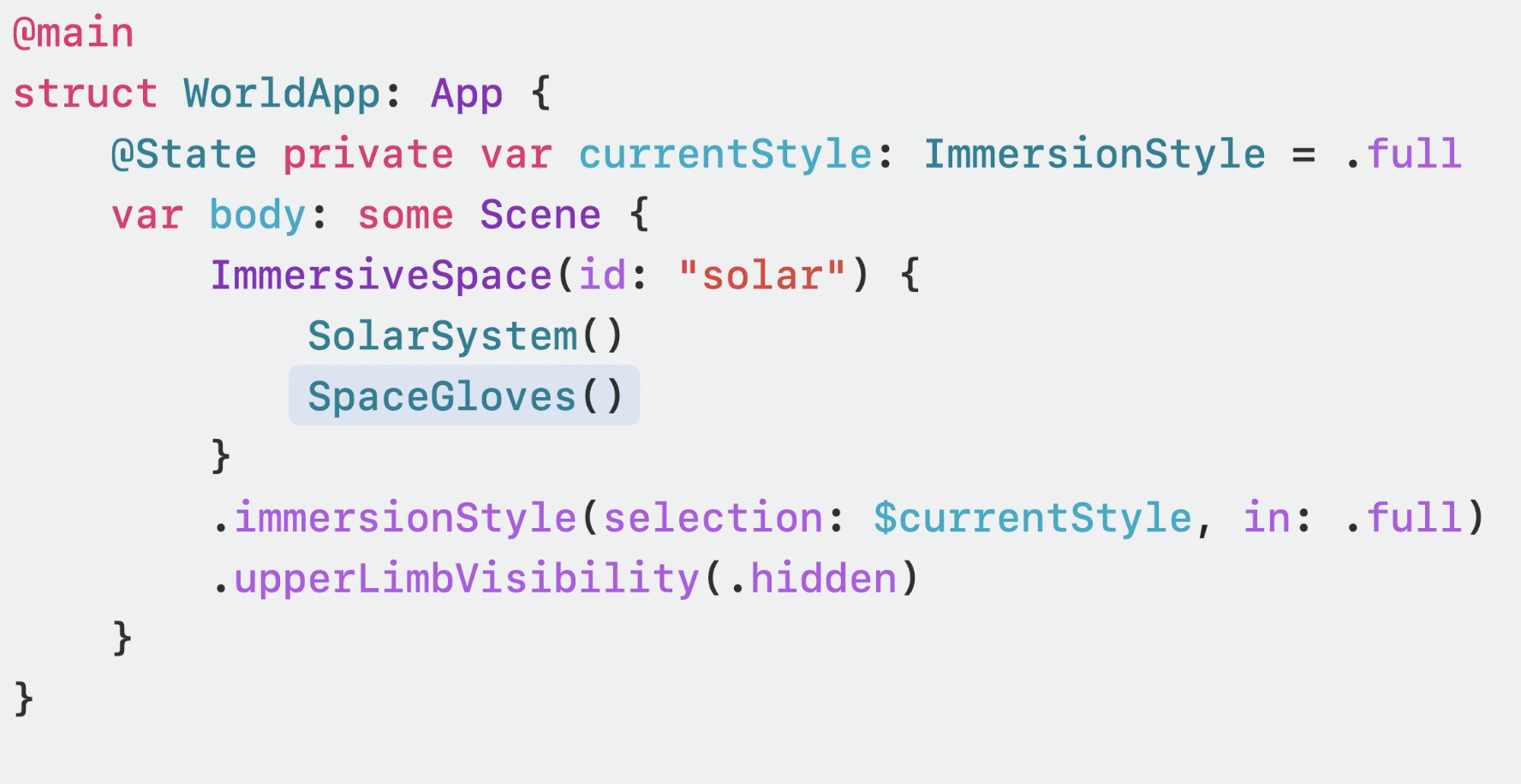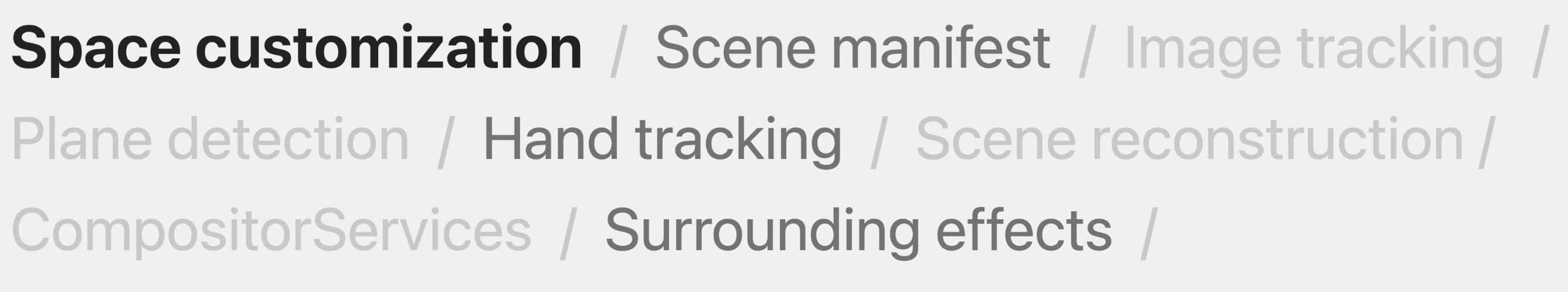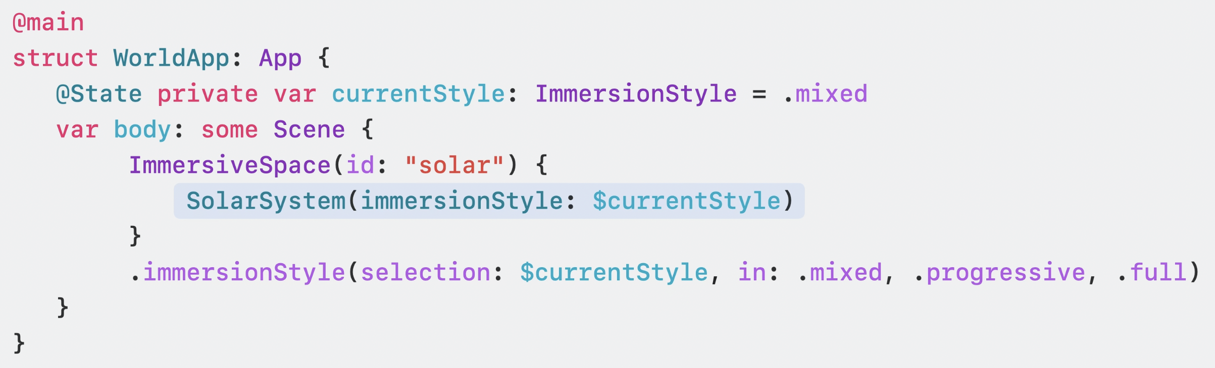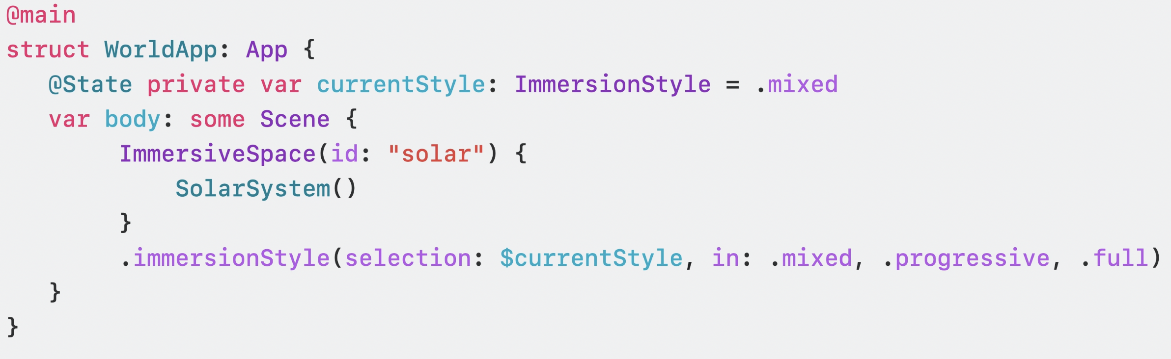 scene의 modifier로 immersion style을 추가하고, Space가 제공했으면 하는 것들의 list를 제공한다.