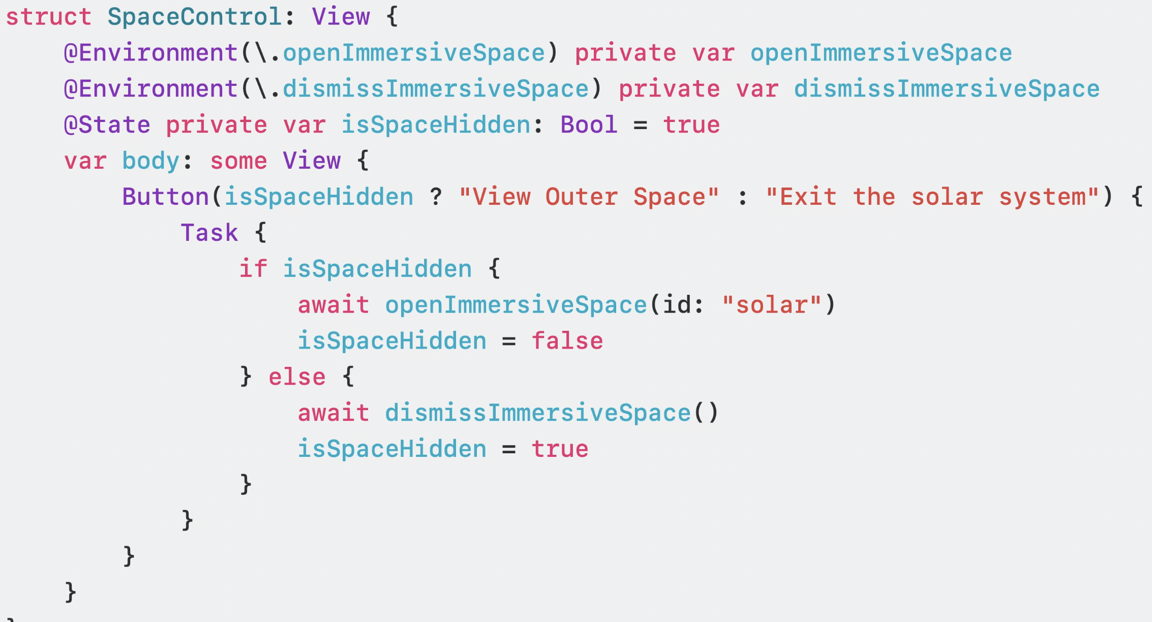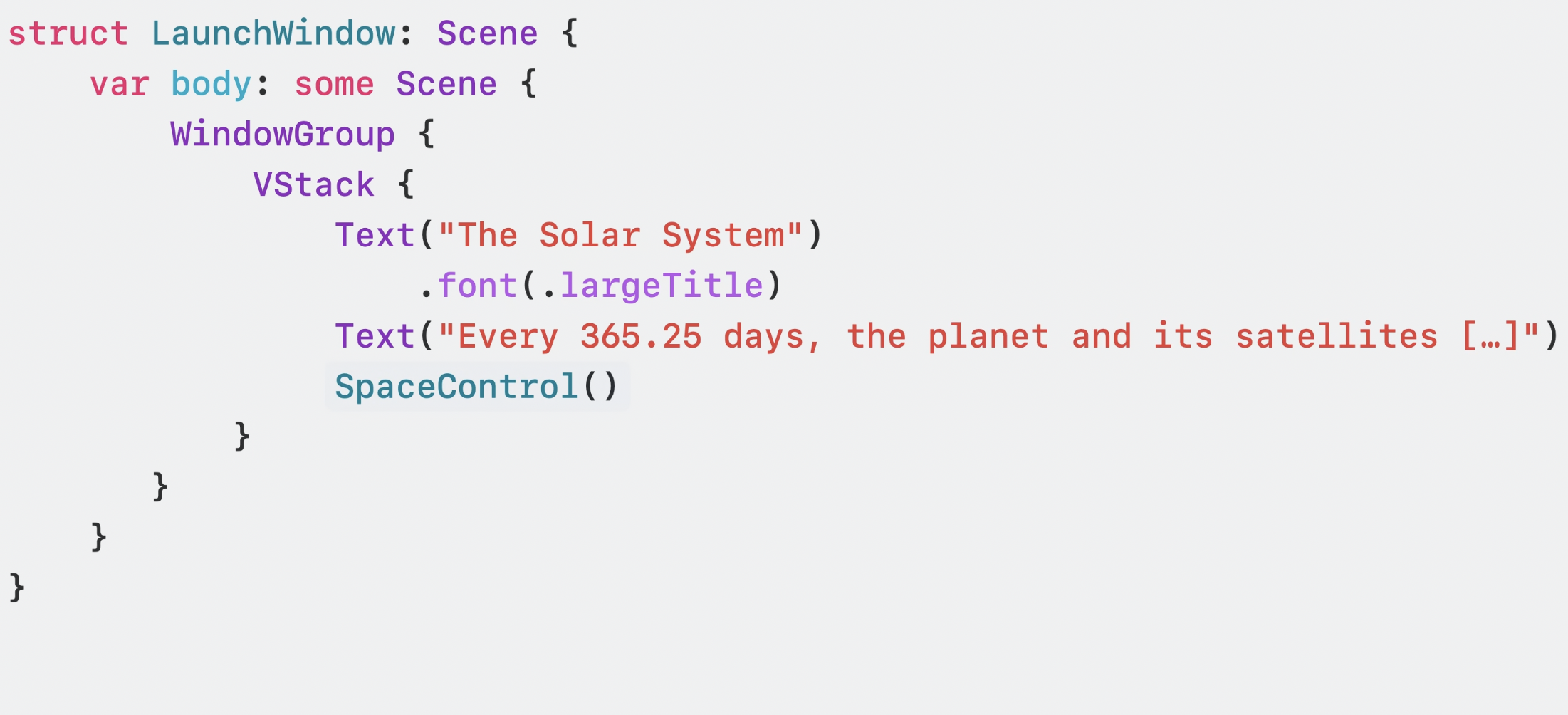 이 두 scene의 순서를 보면 LaunchWindow가 scene들 중 첫번째로 위치해 있다. 따라서 SwiftUI는 launch window를 앱이 시작할 때 보여주고 Immersive Space는 시작할 때 보여지지 않고 버튼이 눌릴 때만 보이게 된다.