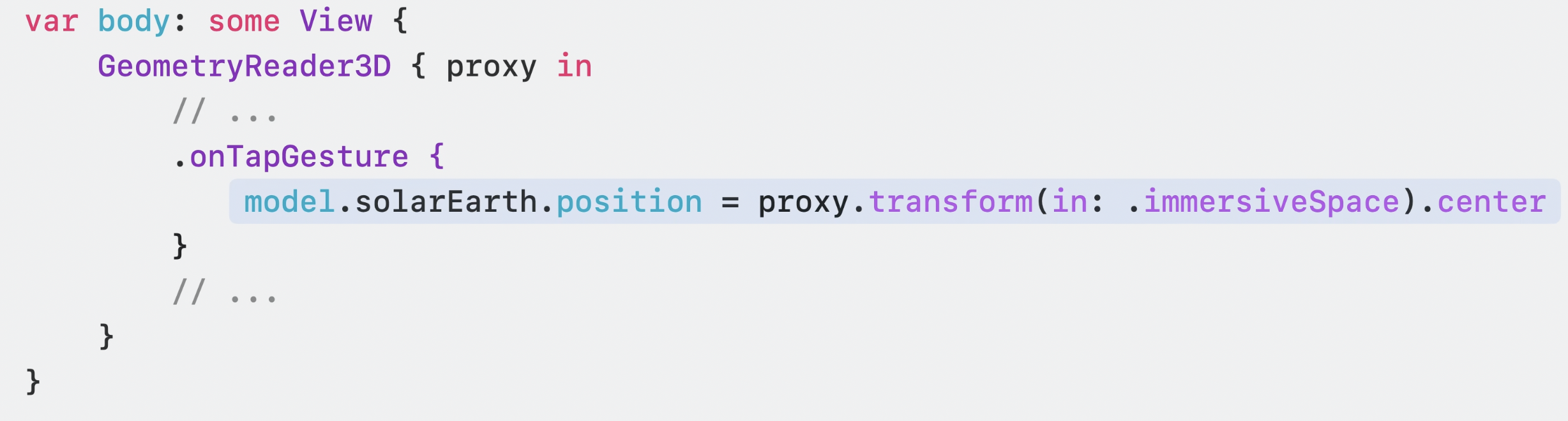 그러면 transform과 같은 coordinate 공간을 가지고 있는 기존 API를 이용하여 Immersive Space 타입을 제공하면 새로운 좌표계에서 proxy.transform을 얻을 수 있다.