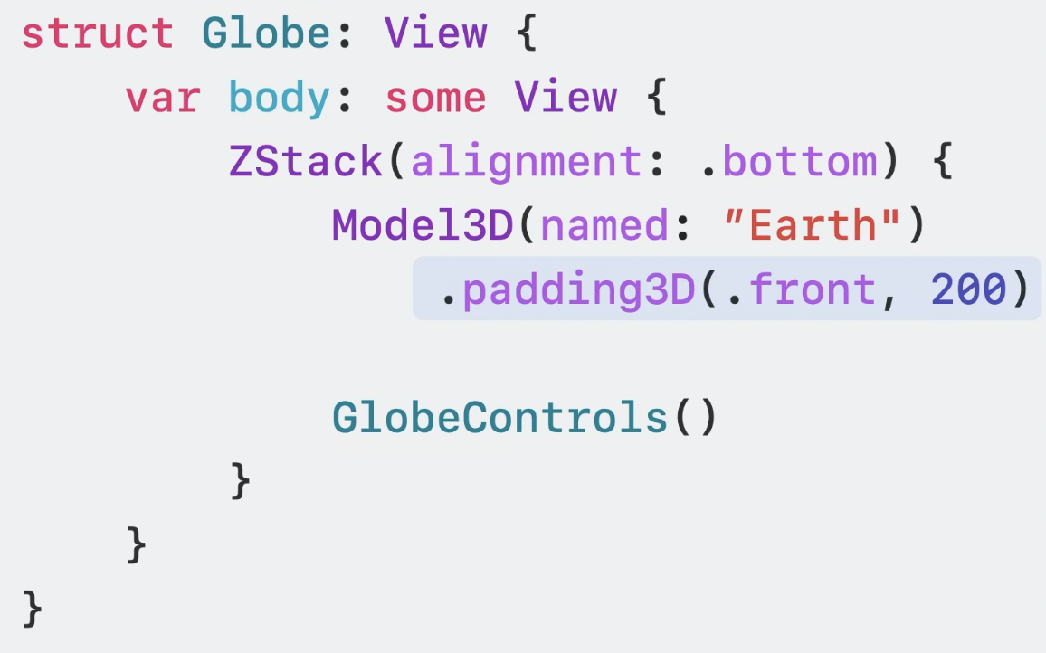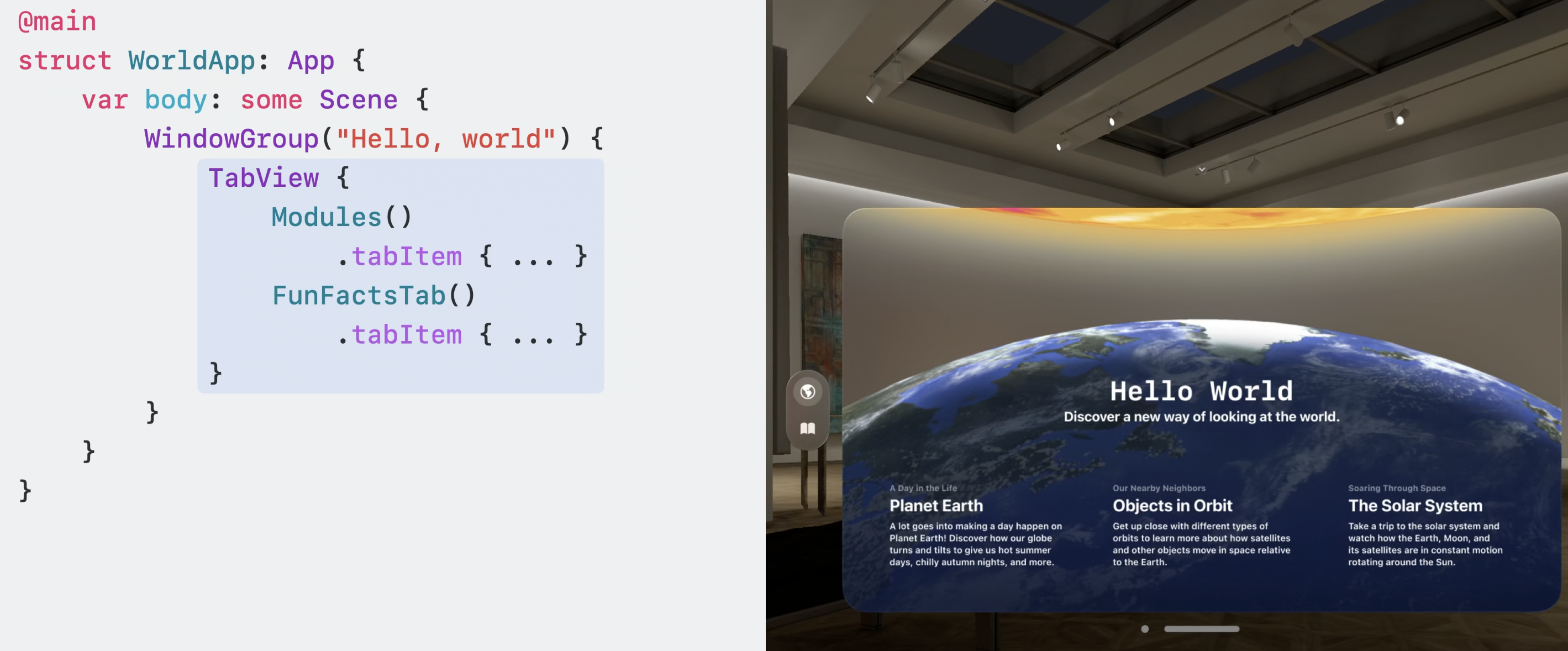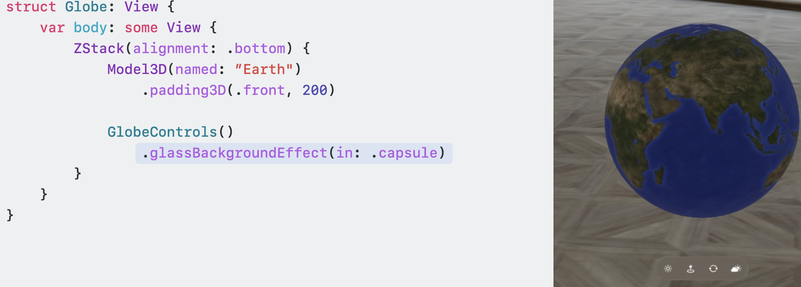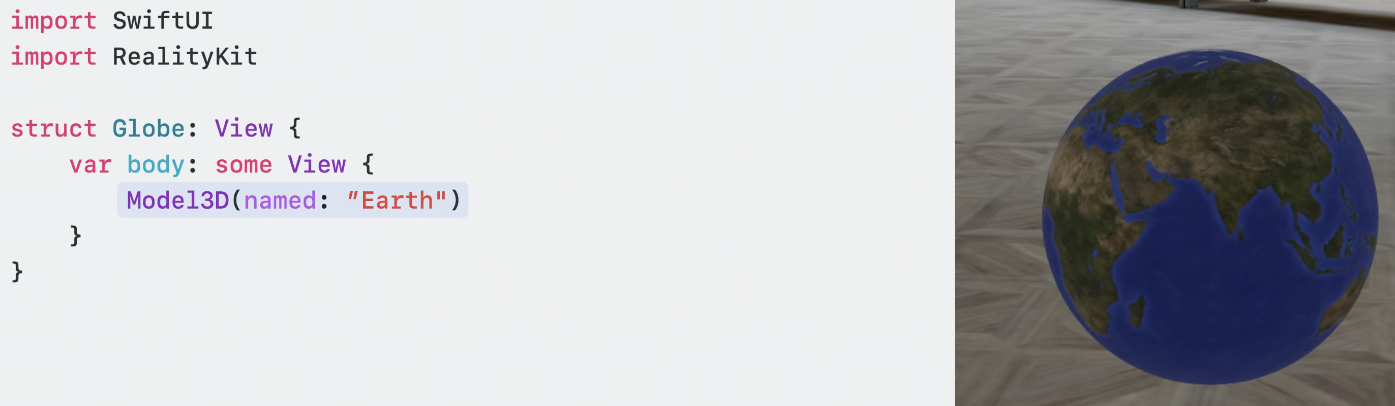 3D 지구 모델을 display하기 위해 RealityKit의 새로운 Model3D API를 사용한다. 이 API를 통해 손 쉽게 앱에 3D 콘텐츠를 추가할 수 있다.