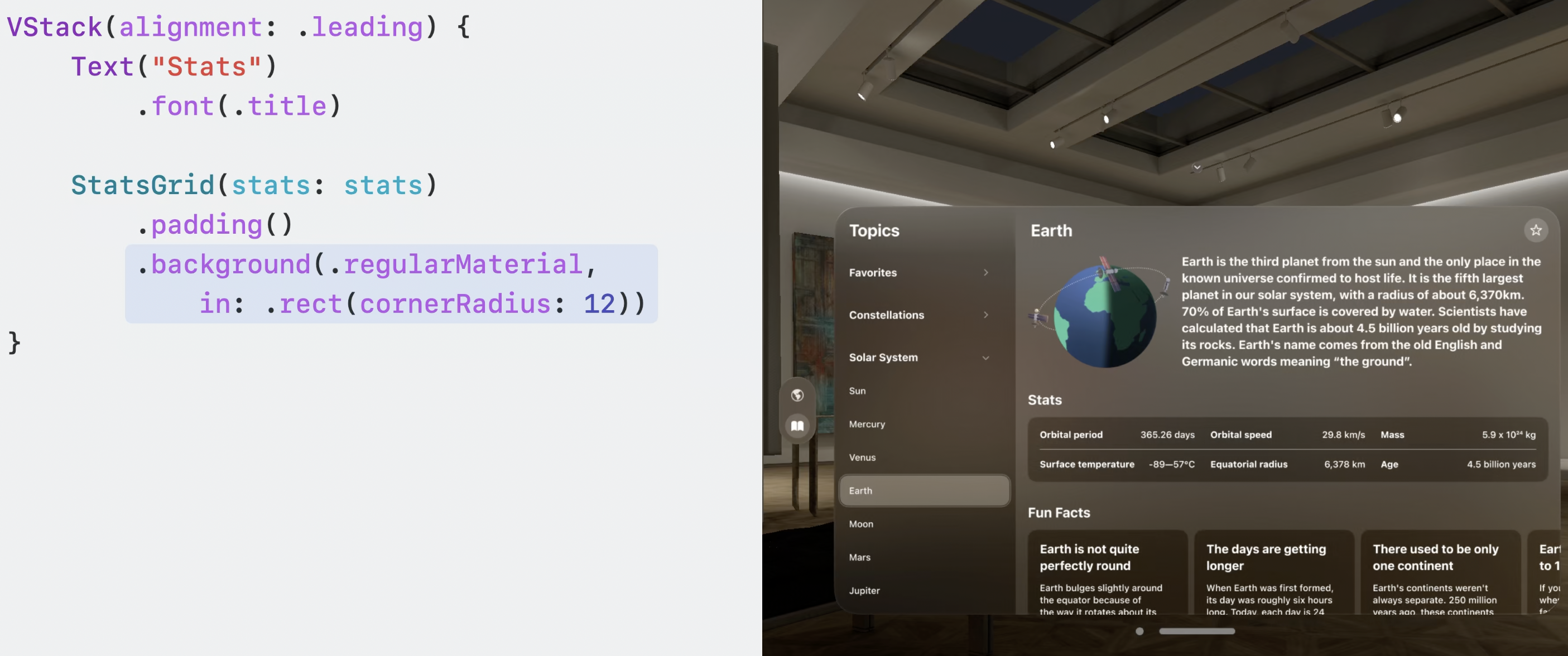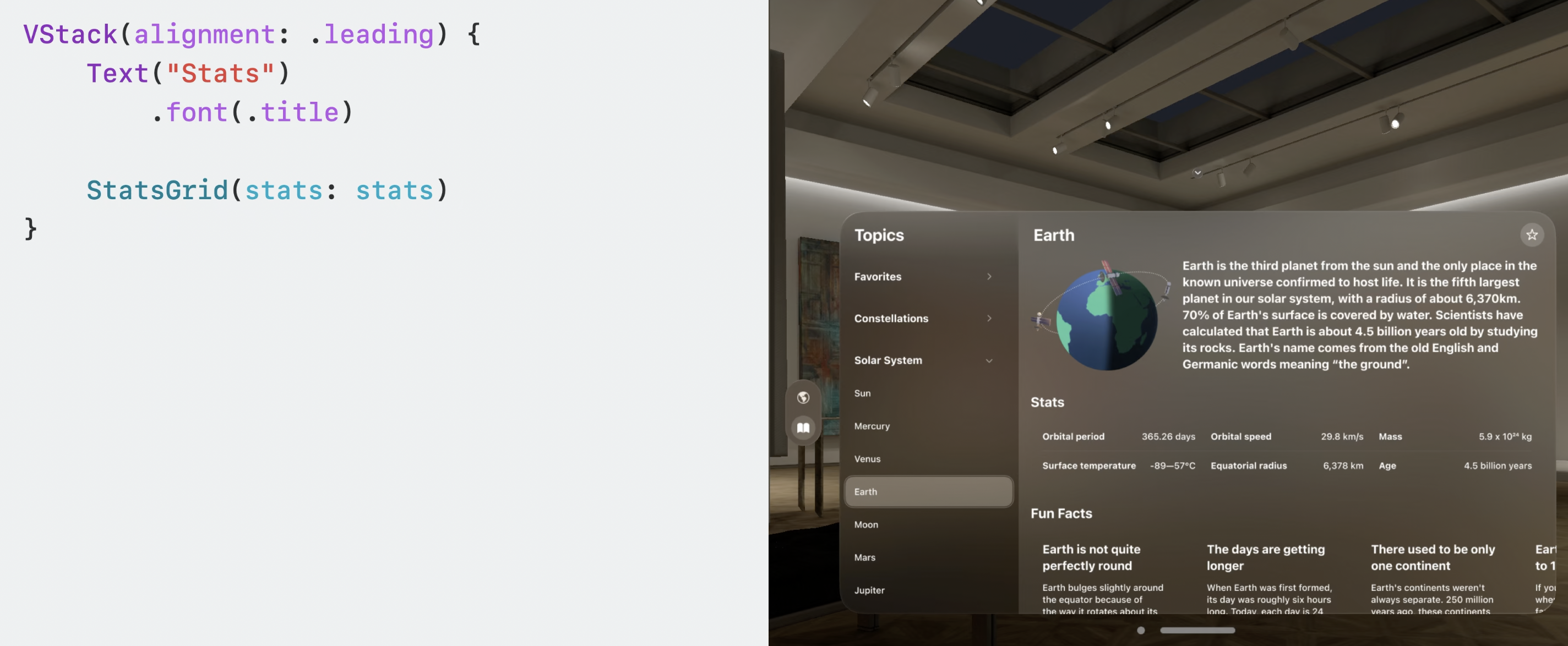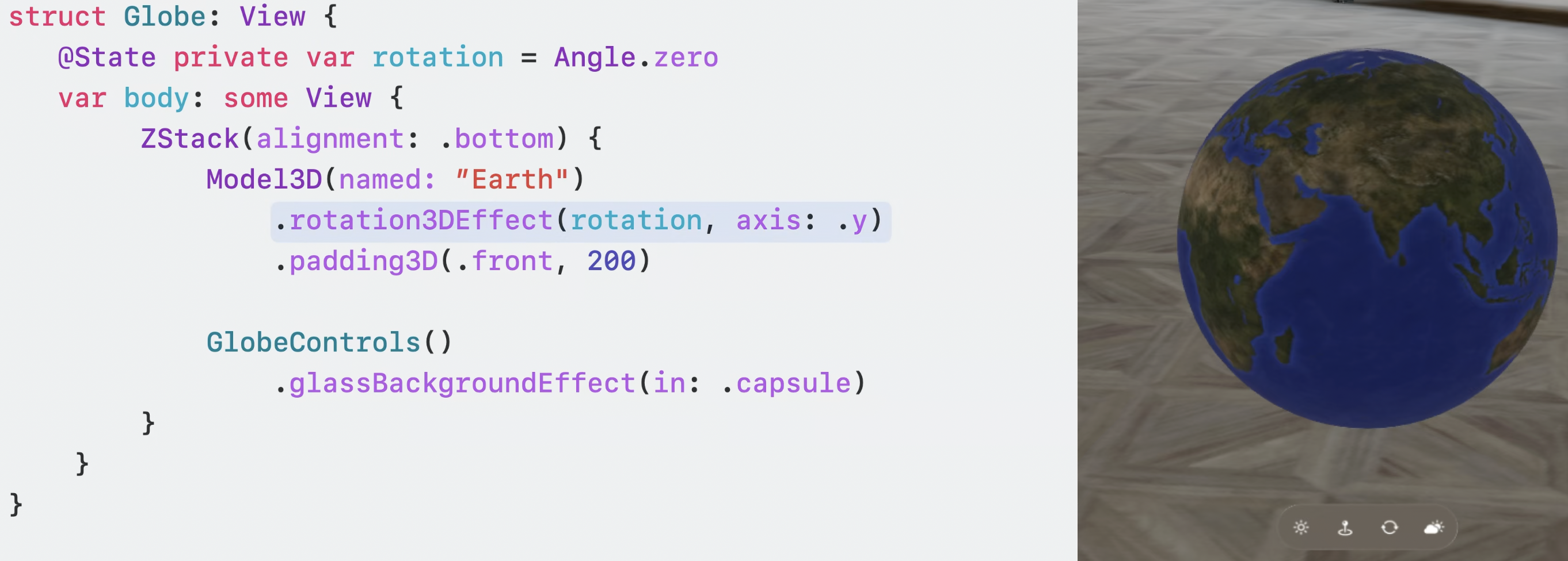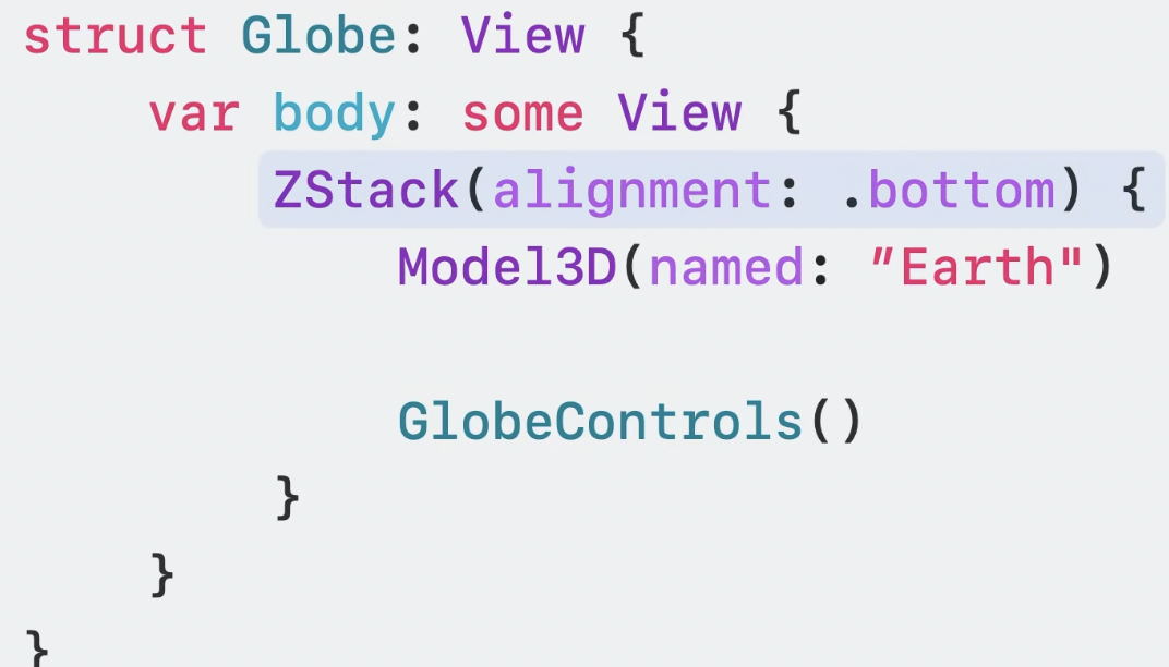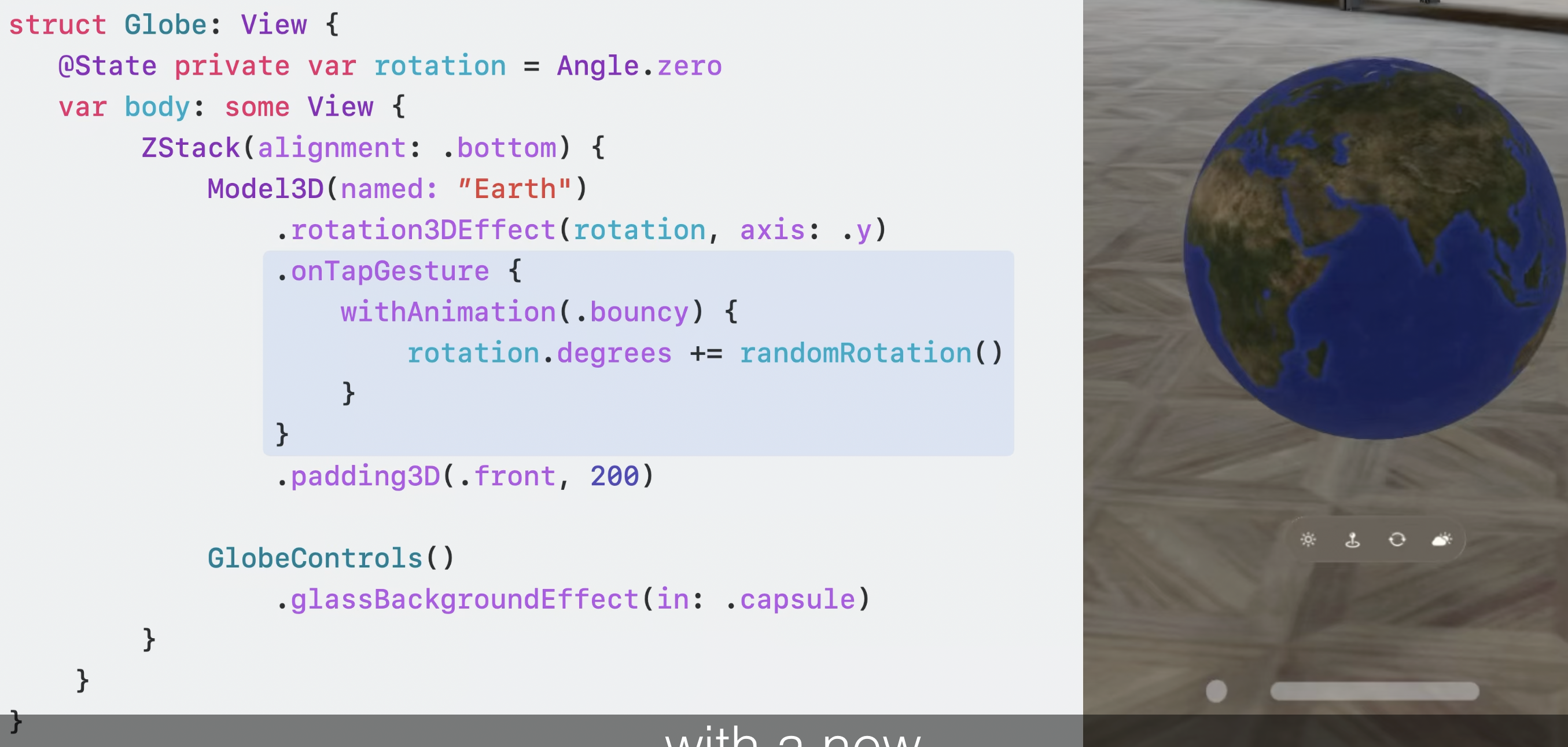 3D 지구 모델을 display하기 위해 RealityKit의 새로운 Model3D API를 사용한다. 이 API를 통해 손 쉽게 앱에 3D 콘텐츠를 추가할 수 있다.