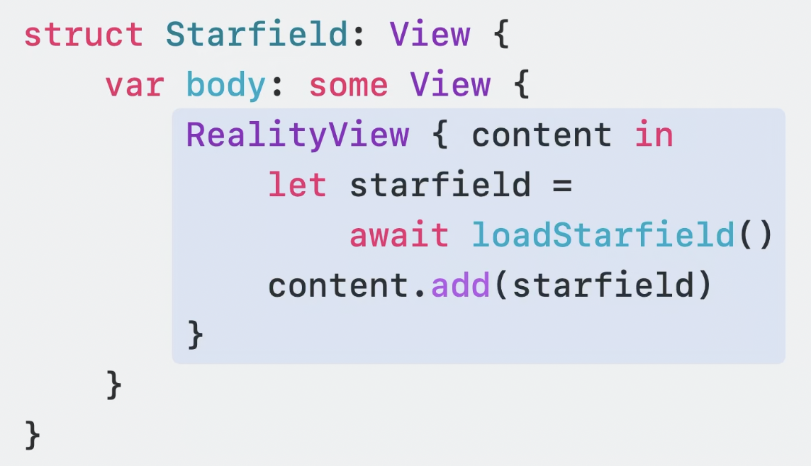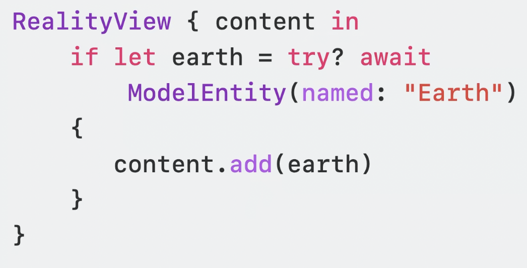 RealityView closure 안에서는 async-await를 바로 쓸 수 있고, 3DModel처럼 자동적으로 콘텐츠를 불러올 때 placeholder를 보여준다.