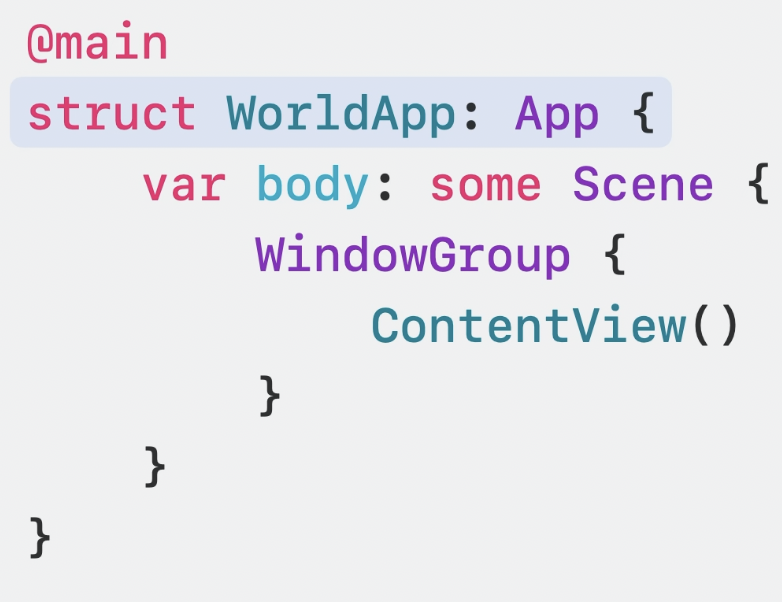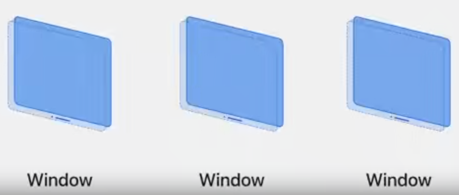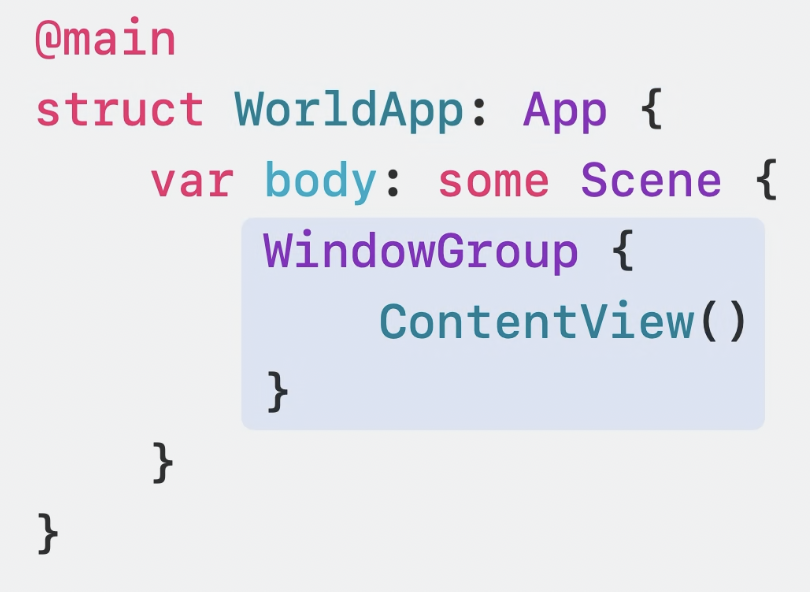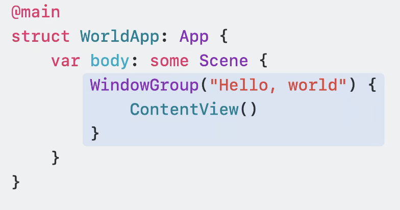 window를 보여주기 위해 다른 플랫폼들처럼 WindowGroup을 이용해준다. WindowGroup을 사용함으로 인해 macOS나 iPadOS처럼 자동적으로 여러 window를 사용할 수 있게 된다.