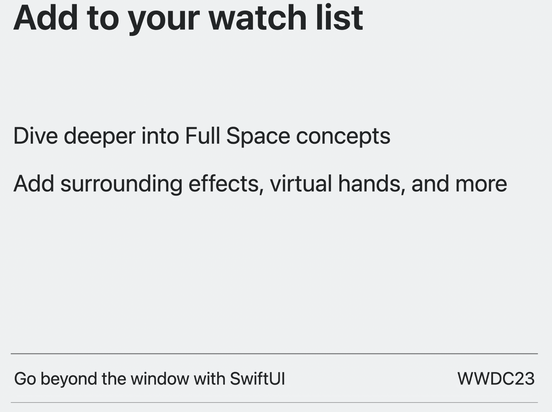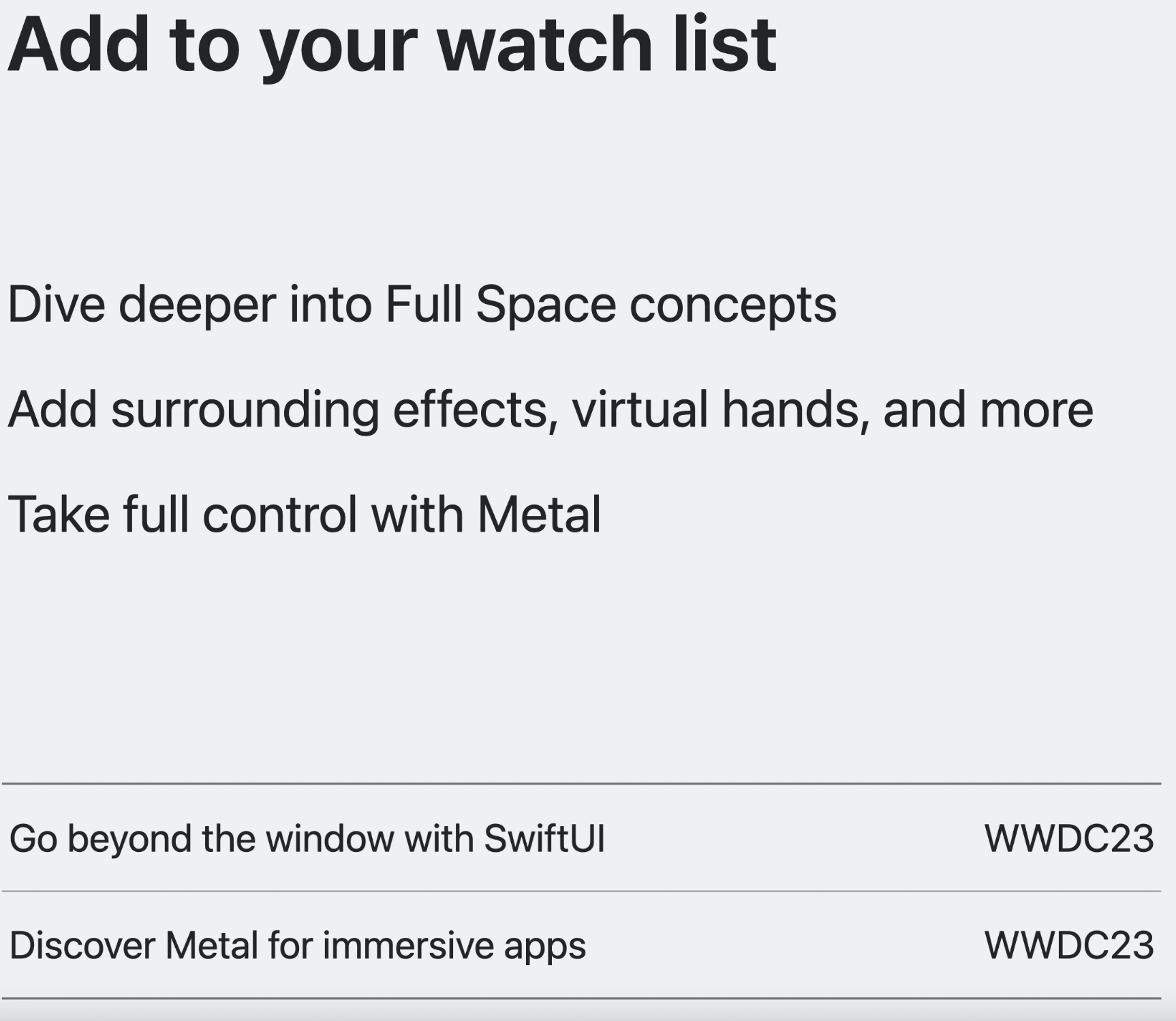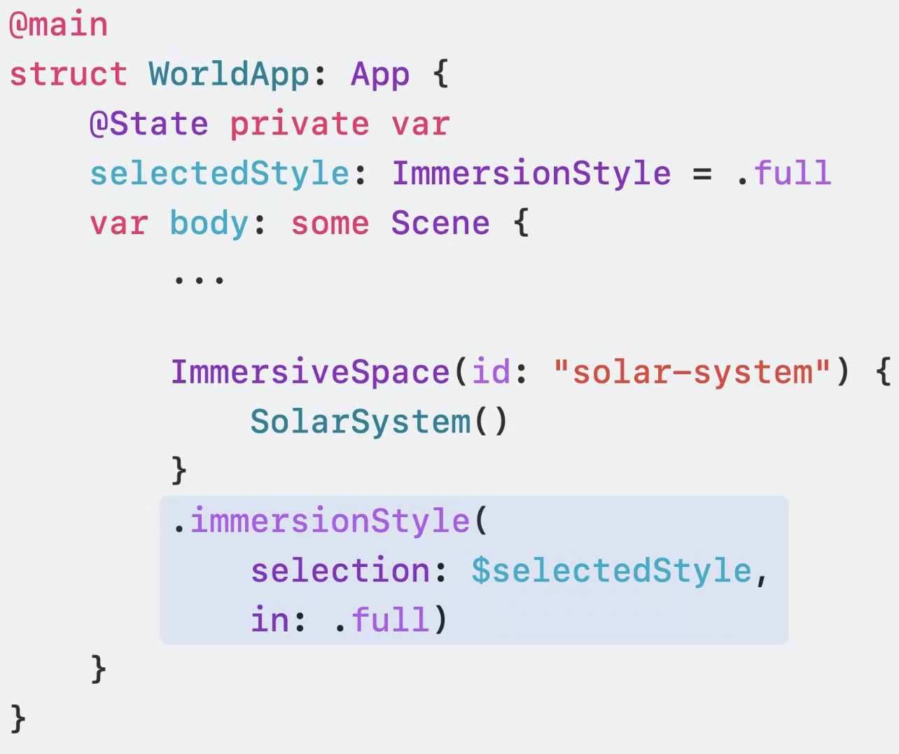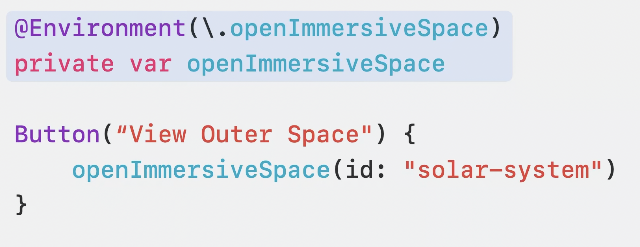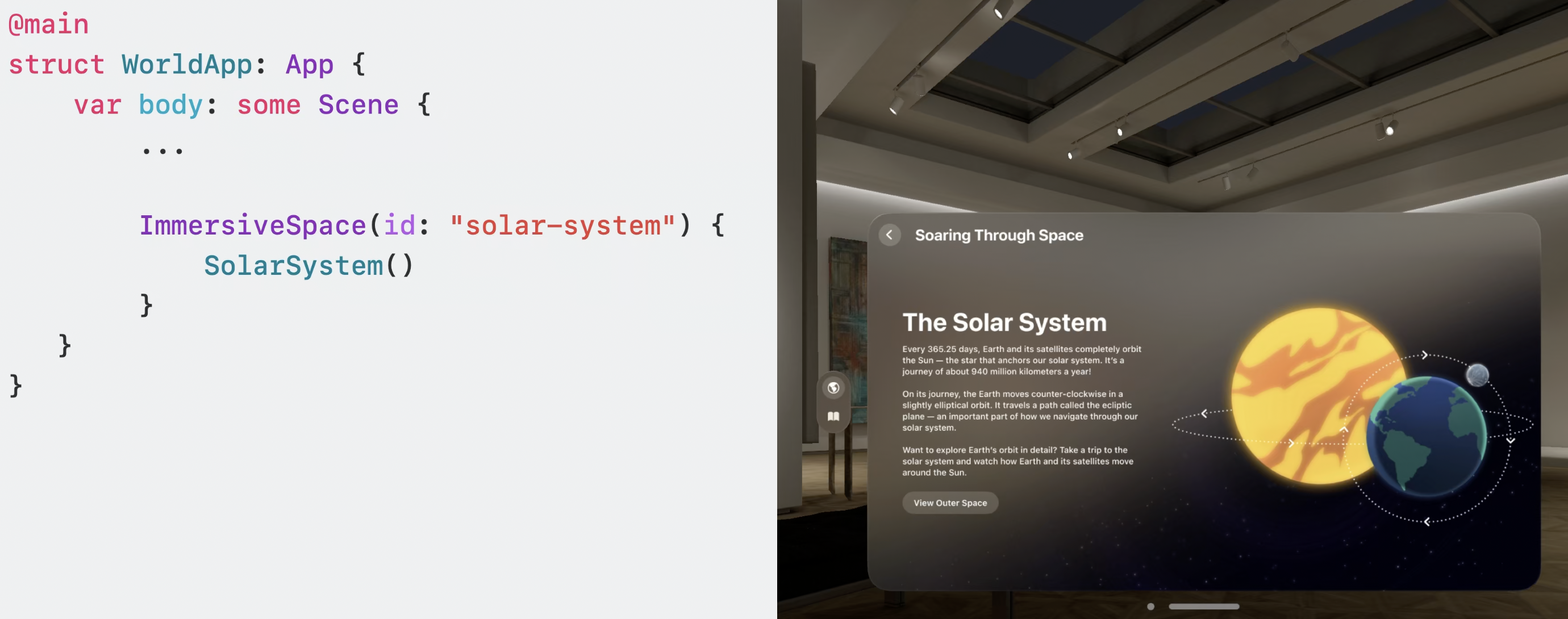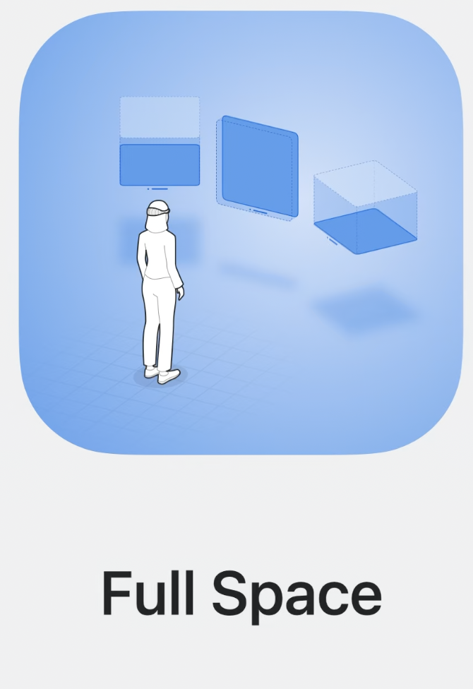 Full Space를 앱에 추가하기 위해서는 WindowGroups에 했던 것처럼 단순히 새로운 ImmersiveSpace scene을 추가하면 된다.