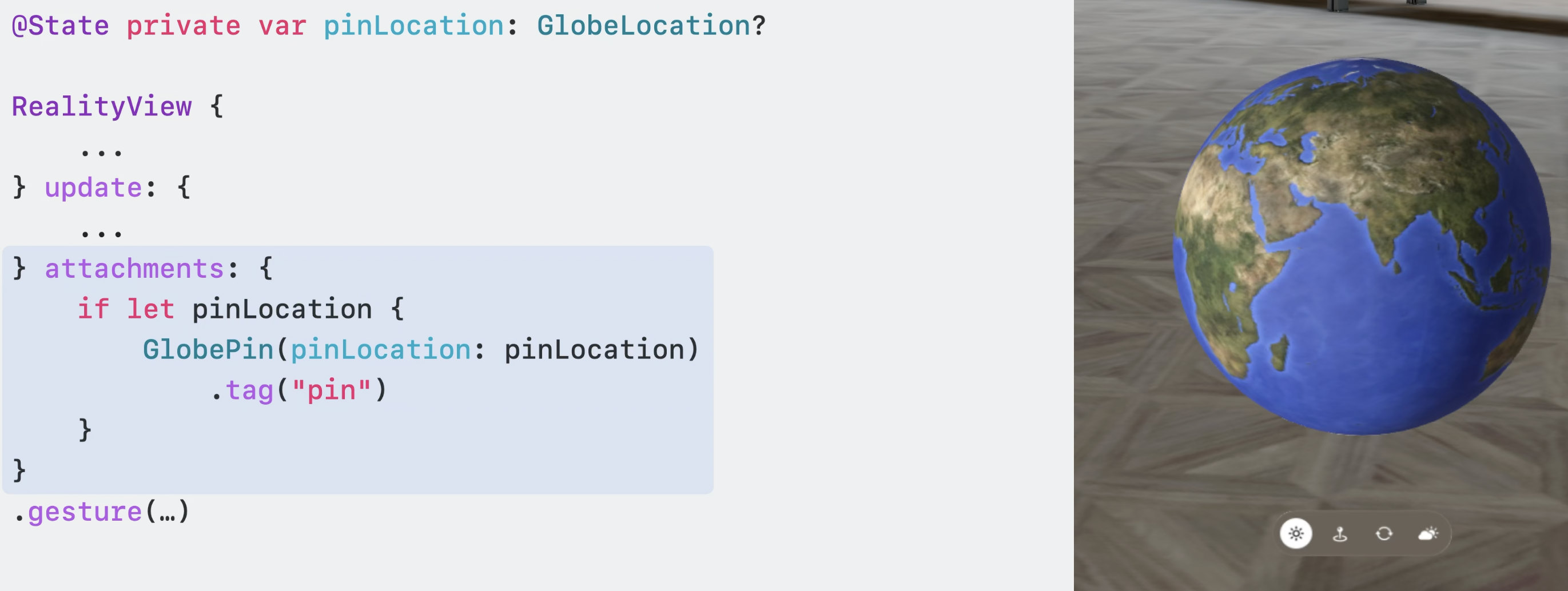 지구에 핀을 그리기 위해서는 RealityView attachments를 사용할 수 있다.
