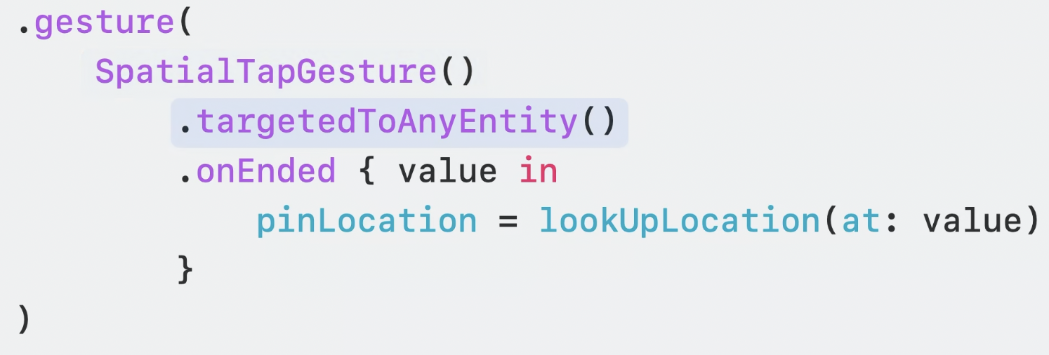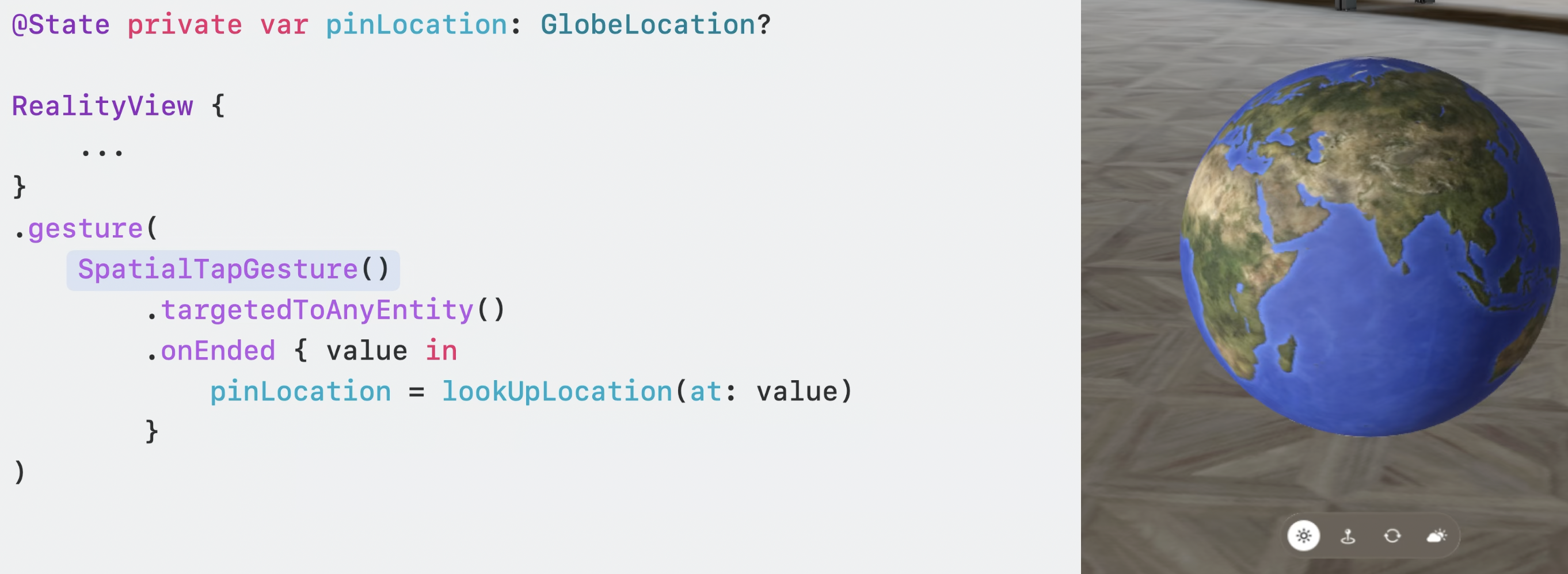 지구 entity에서 어딜 탭한건지 식별하기 위해 targetedToAnyEntity gesture modifier를 활용한다. 이 Modifier를 통해 tap한 entity에 대한 상대적인 위치 등 필요한 정보를 얻을 수 있다.
