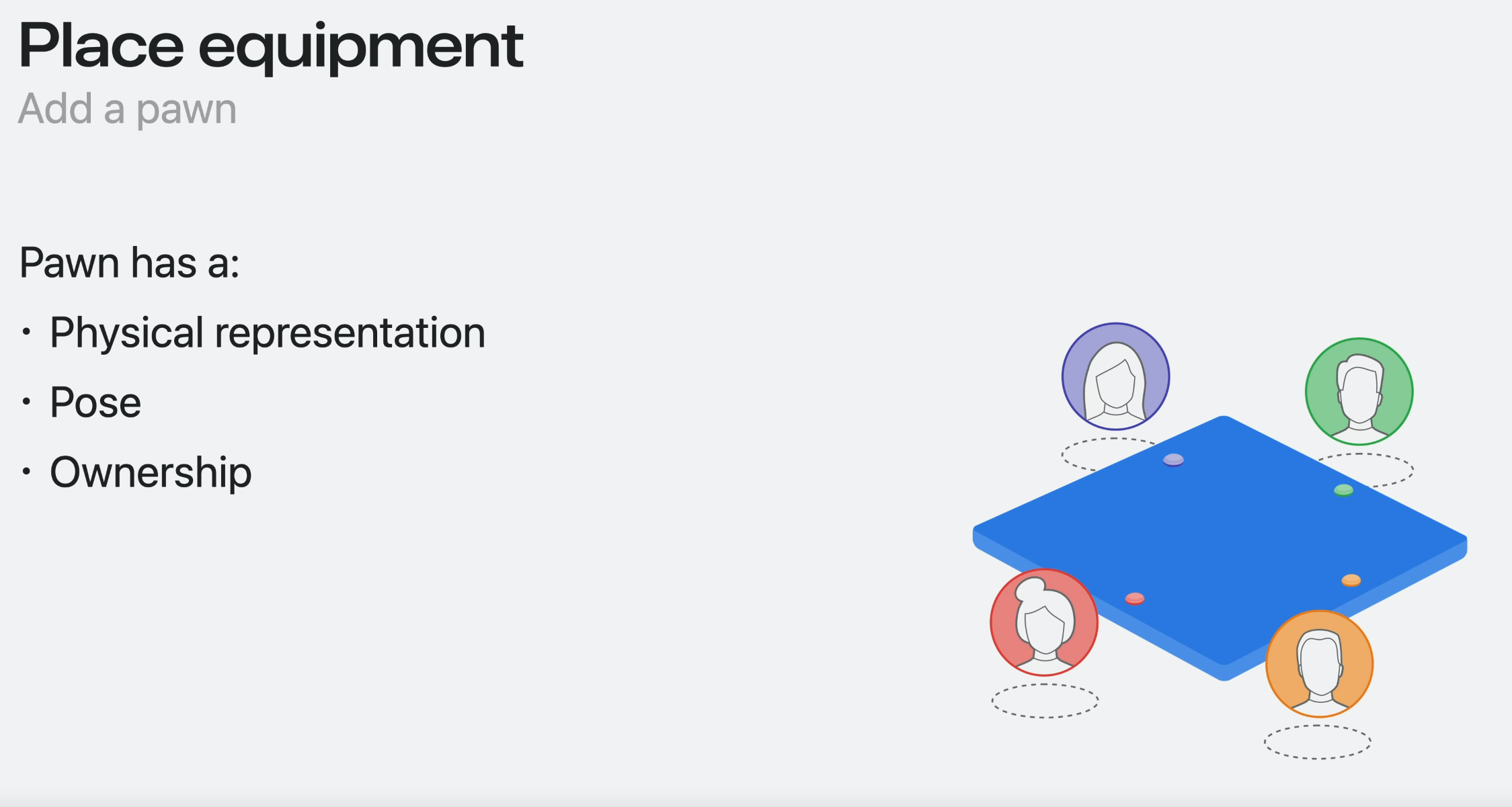 pawn은 플레이어가 보드 위에서 움직이는 물체다. pawn은 게임의 물리적인 물체이며 RealityKit entity로 렌더링된다. 따라서 고유한 크기를 가지고 플레이어가 상호작용 할 수 있다.
