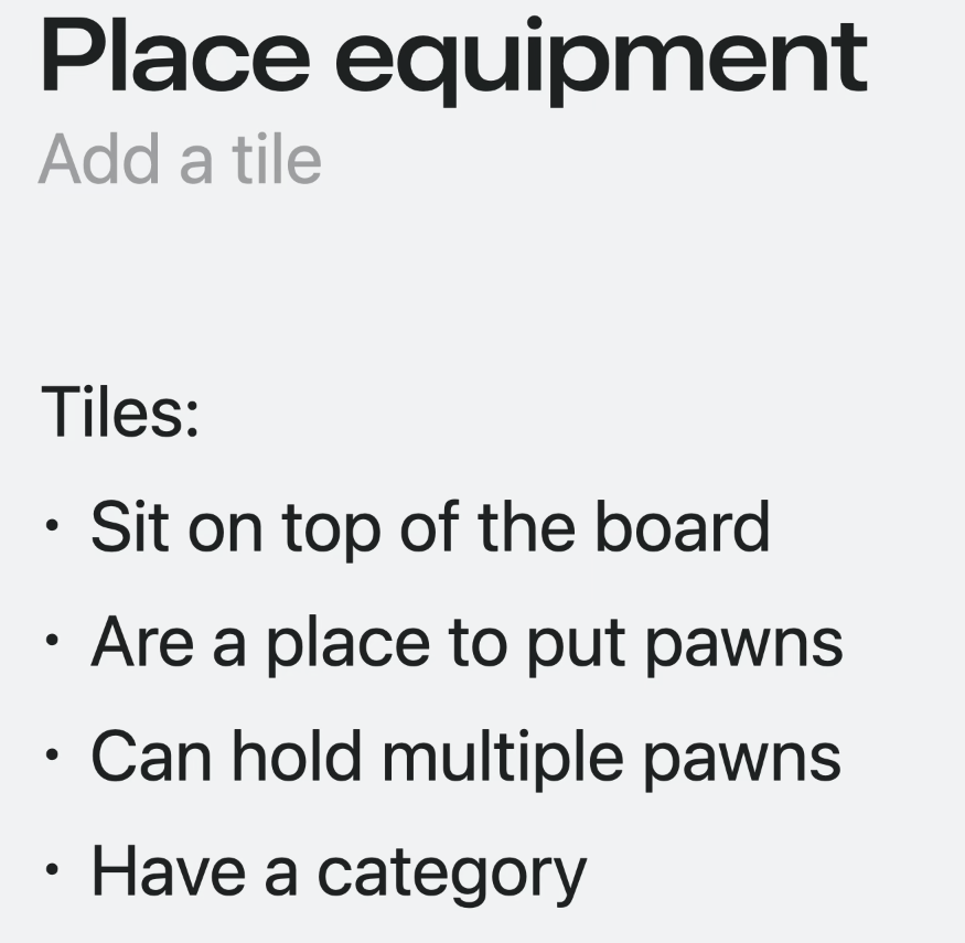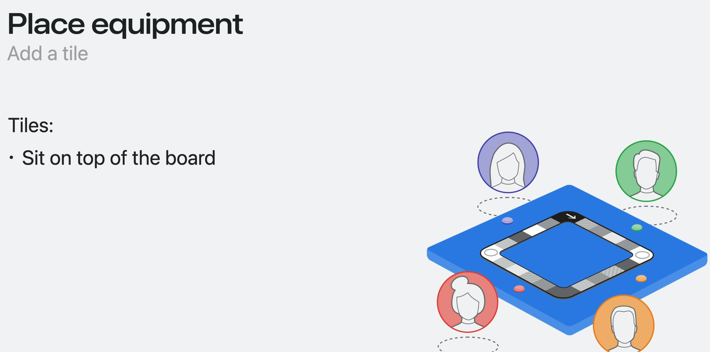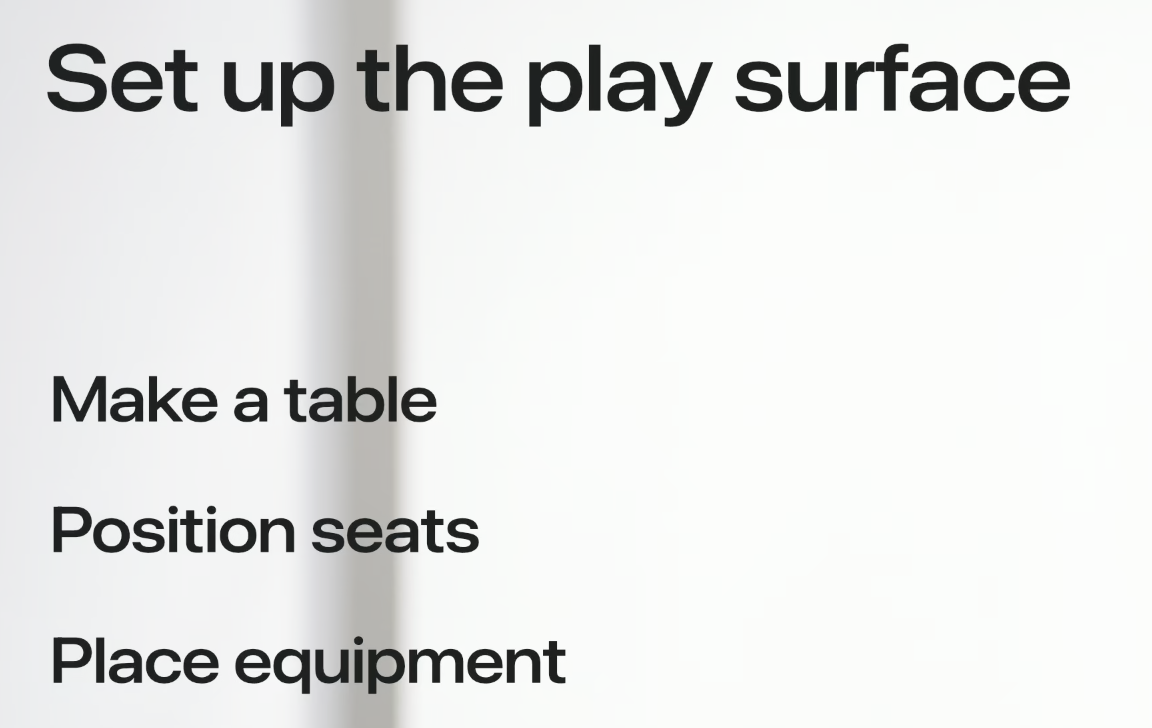 그래서 테이블부터 시작하여 사용자가 앉을 자리를 결정하고 보드 위에 게임 타일을 배치하고 그 위에 사물을 추가한다.
