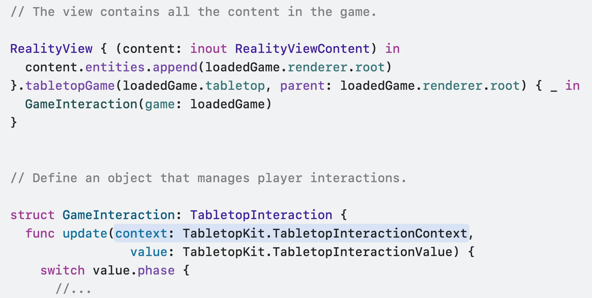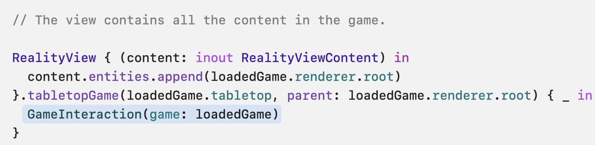 게임을 RealityView에 연결할 때 TabletopInteracion object를 구현한 결과물을 전달한다.