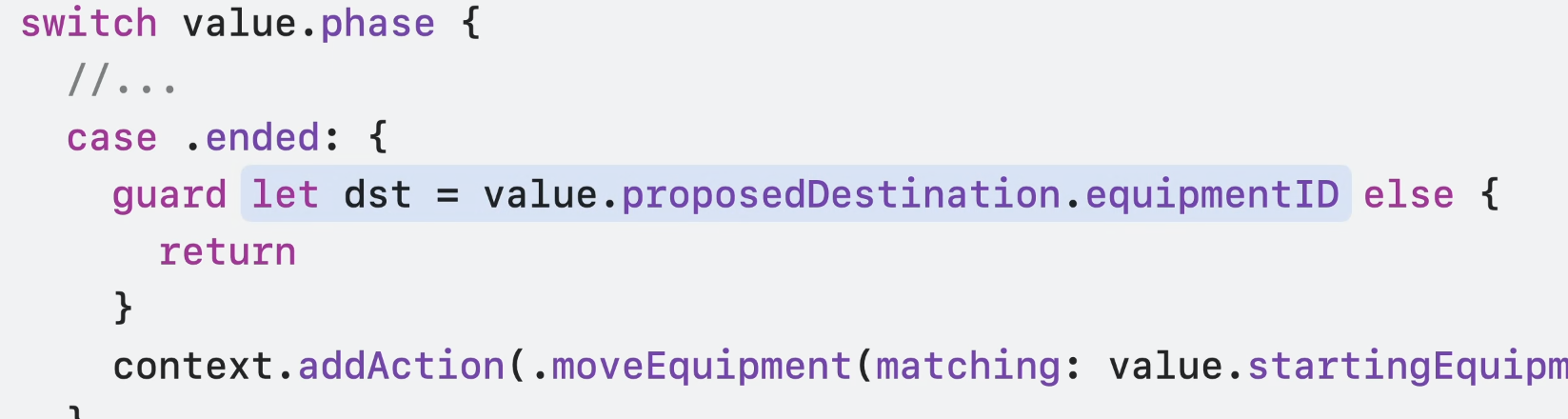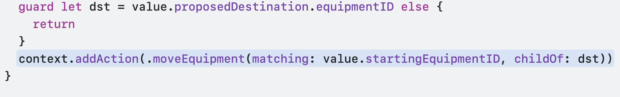 존재한다면 상호작용 컨텍스트에 동작을 추가해서 해당 equipment를 요청된 부모 equipment로 이동한다. 따라서 플레이어가 게임 보드에서 말을 움직이고 카드를 손으로 가져오고 주사위를 던질 수 있다.