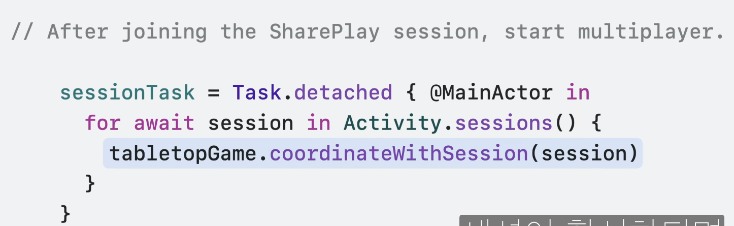 세션이 활성화되면 GroupActivities 세션과 상호작용하도록 TabletopKit에 알린다. 이렇게 하면 활성 플레이어 간 게임 상태가 동기화 된다.