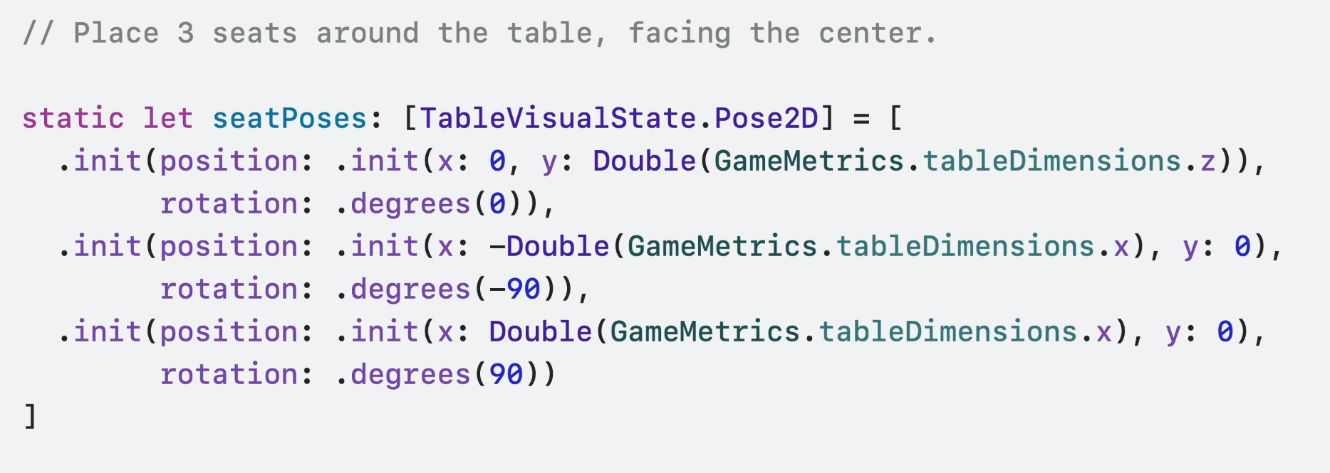 이 게임에는 3명의 Player가 있다. 그래서 고유 ID를 가진 seat 3개를 테이블 주변에 같은 간격으로 배치하고 seat가 테이블 중앙을 향하도록 설정하겠다.