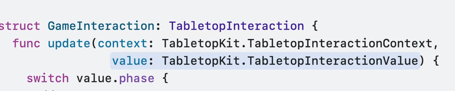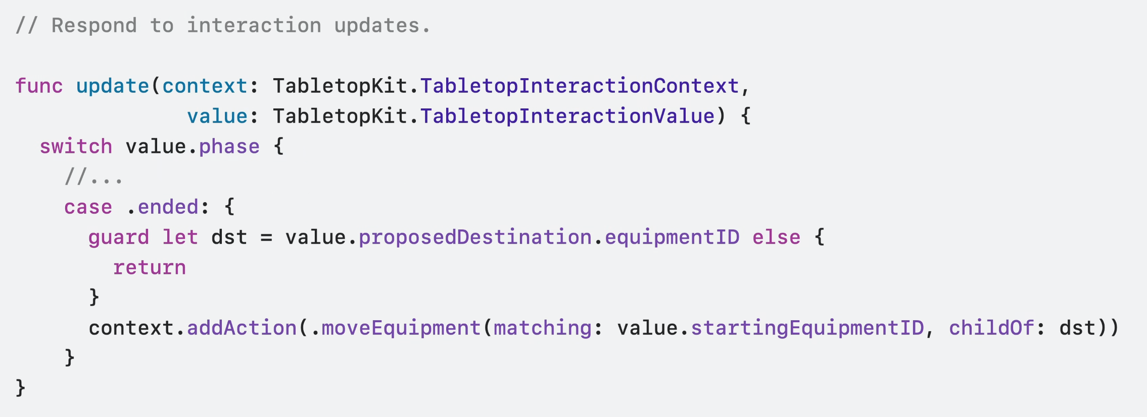 TabletopKit은 시스템 제스처를 모니터링해서 SwiftUI Scene과 동일한 제스처를 사용할 수 있다. 각 interaction마다 게임 상태를 변경하는 동작을 추가할 수 있다.