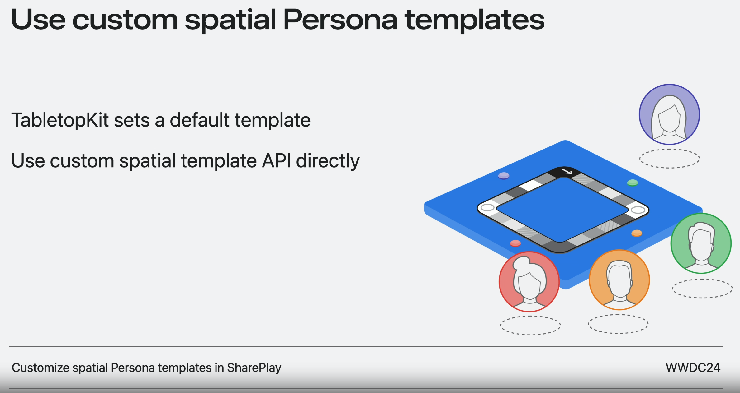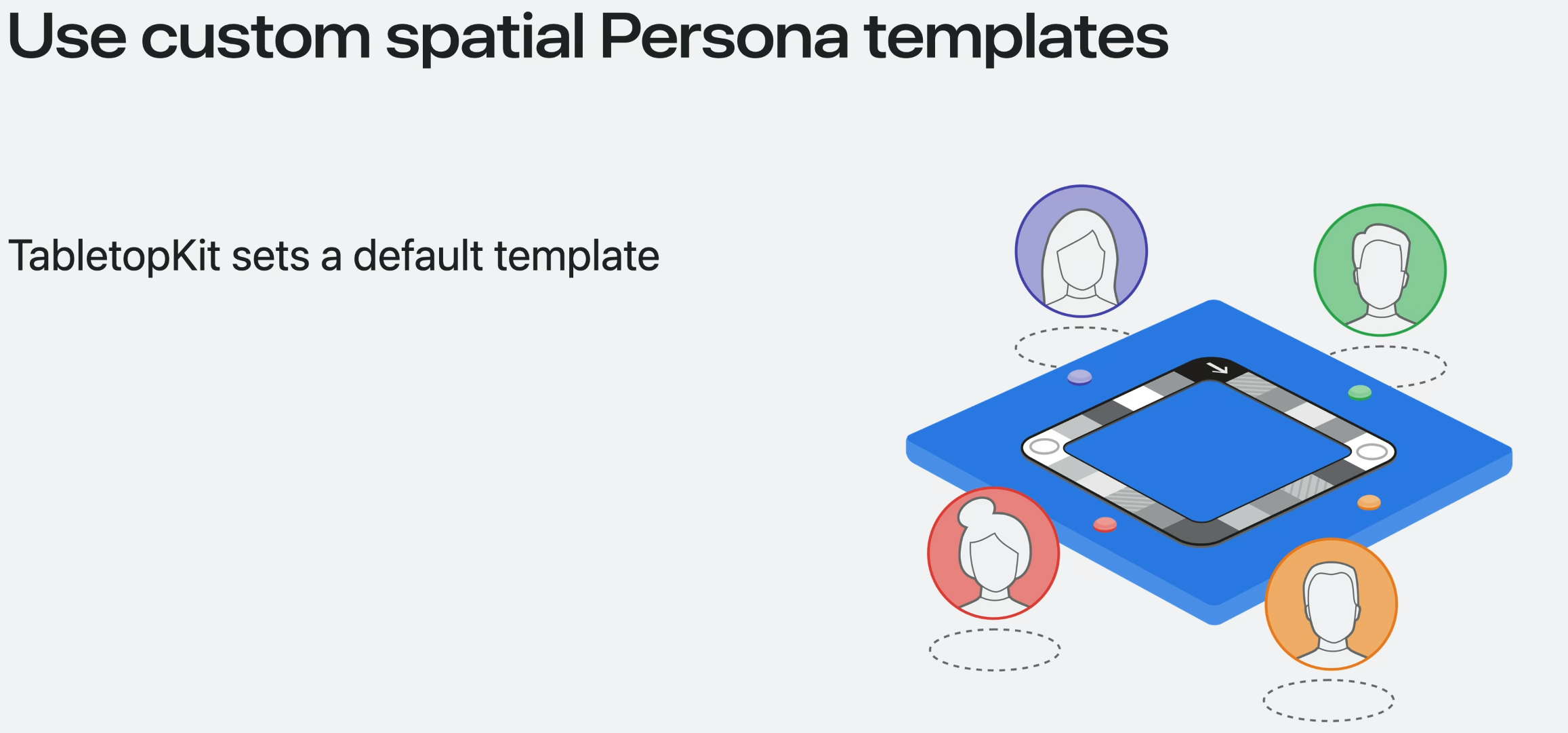 다른 공간 설정을 사용하려면 custom spatial persona template API로 원하는 템플릿을 설정하면 TabletopKit에서 설정하는 기본 템플릿을 오버라이드 한다.