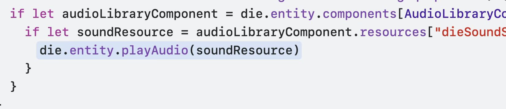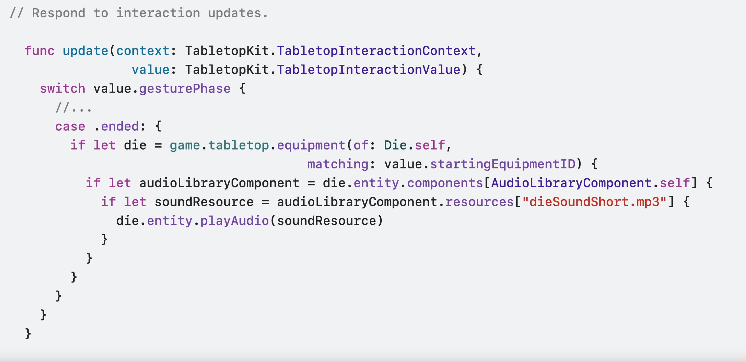 audioLibraryComponent에서 효과음을 찾은 뒤 soundResource가 있으면 RealityKit이 주사위 entity에서 효과음을 재생하도록 지시한다. RealityKit은 Spatial Audio를 처리할 수 있으므로 공간 내에서 효과음이 발생한다.