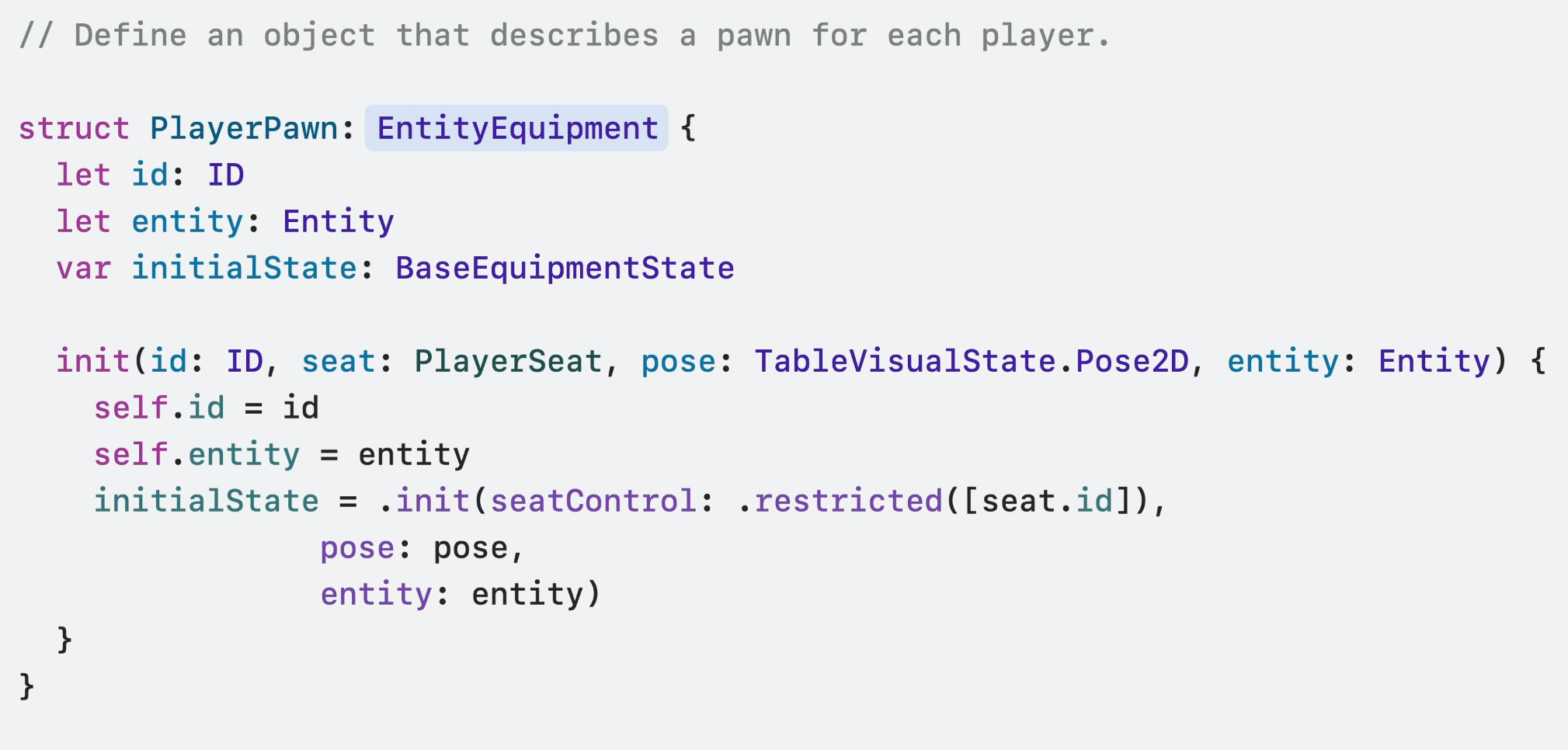 pawn은 EntityEquipment 프로토콜을 따르고 이는 연결된 RealityKit entity가 있음을 의미하므로 게임에서 tangile한(형태를 가진) object이다.