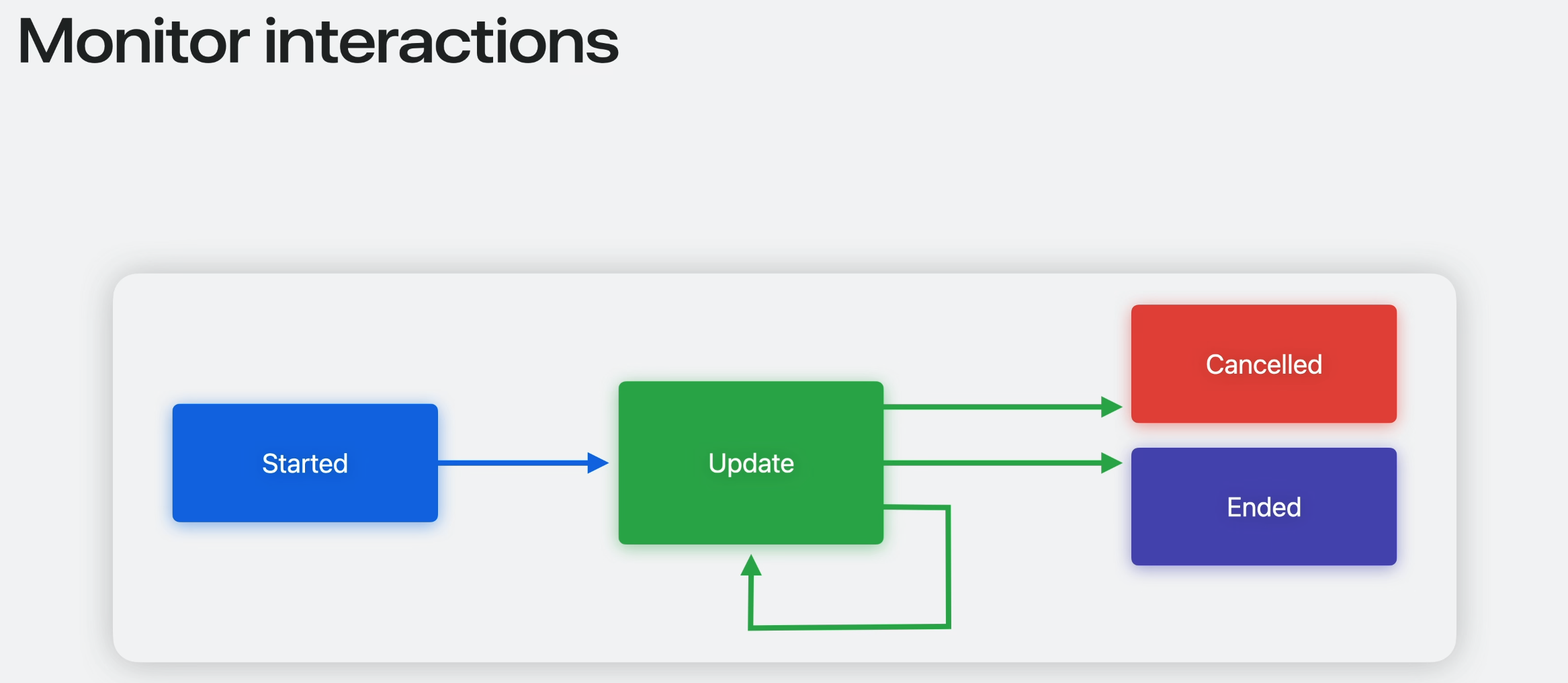 제스처가 업데이트 될 때마다 업데이트 콜백이 호출된다. 컨텍스트에는 관련된 구성요소나 배치할 수 있는 위치 등 수정 가능한 속성이 있다. 또한 interaction을 취소하거나 종료하는 등의 동작을 수행하는 함수가 있다.