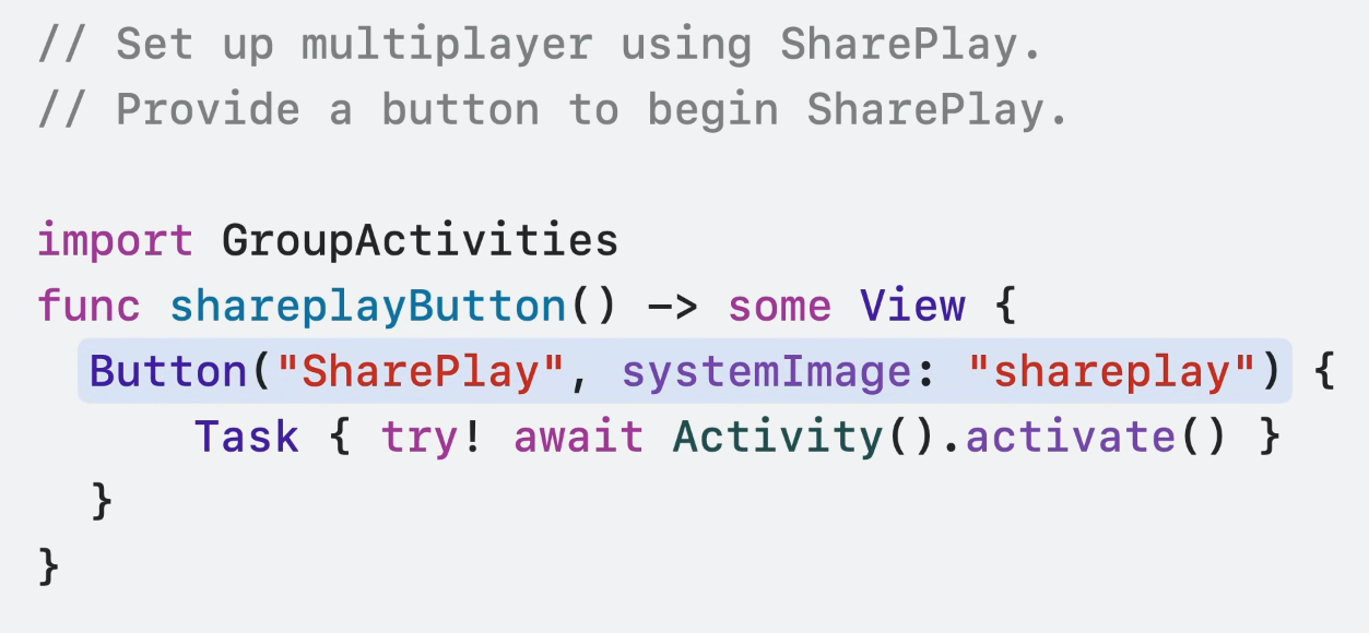 기본 seat 설정을 사용하는 네트워크 게임의 경우 단 몇 줄의 코드만으로 GroupActivities 세션을 시작해 framework에 전달할 수 있다.