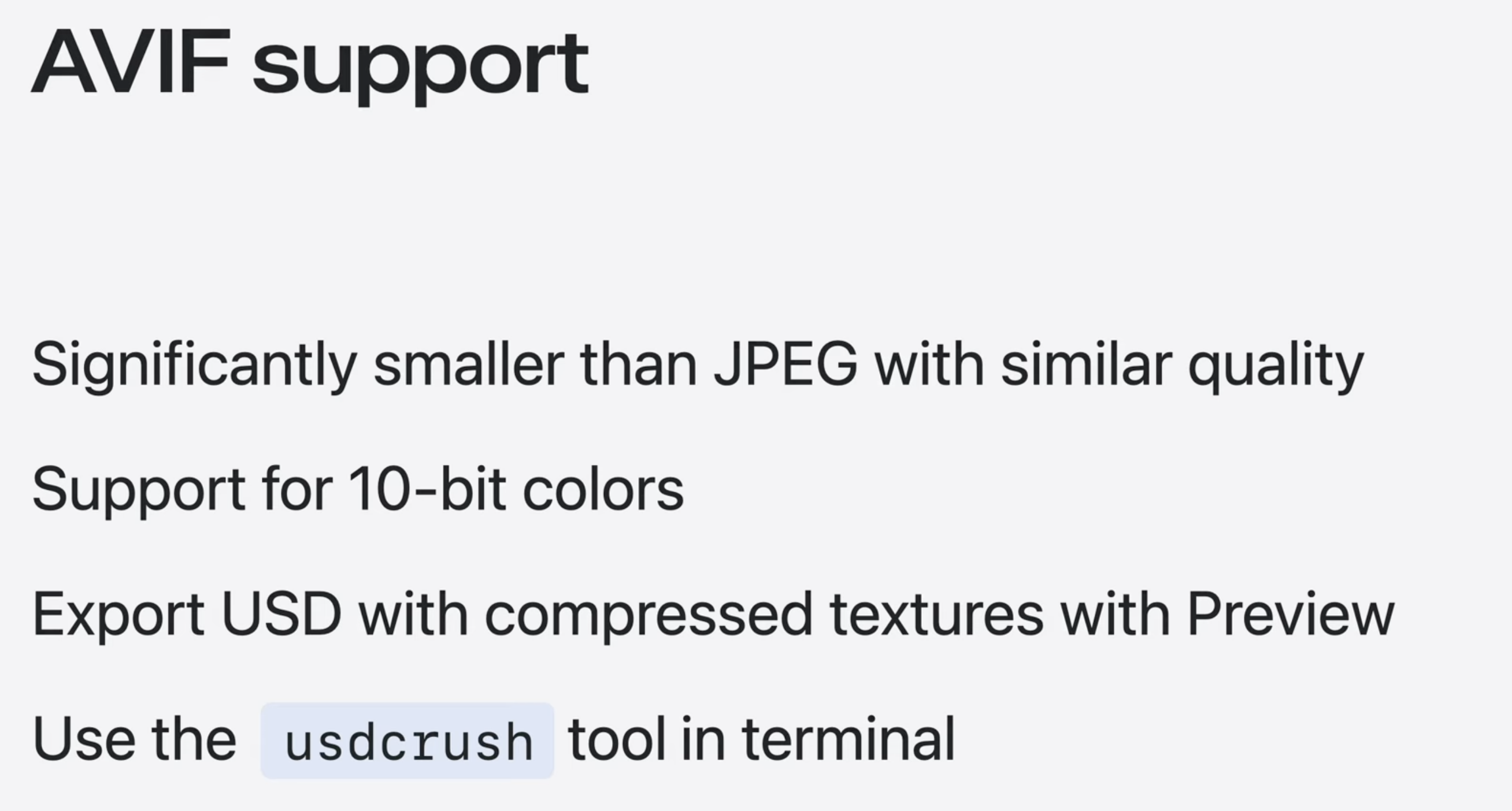 AVIF 인코딩된 텍스처에 대한 지원을 추가하는데, 이는 10 비트 색상을 지원하면서도 크기는 훨씬 작으면서도 JPEG와 비슷한 품질을 제공한다. Mac의 Preview 앱이나 터미널의 usdcrush를 사용하여 이 압축을 활성화한 상태로 USD를 내보낼 수 있다.